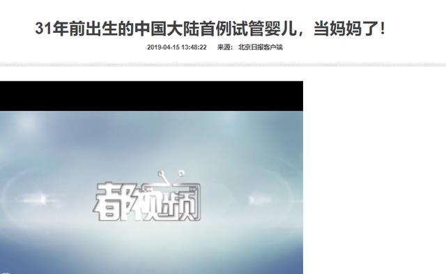 北京日报2019年4月15日《31年前出生的中国大陆首例试管婴儿,当妈妈了!》的报道