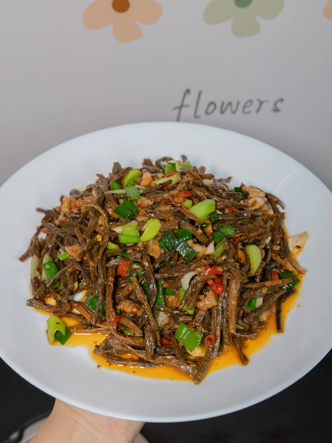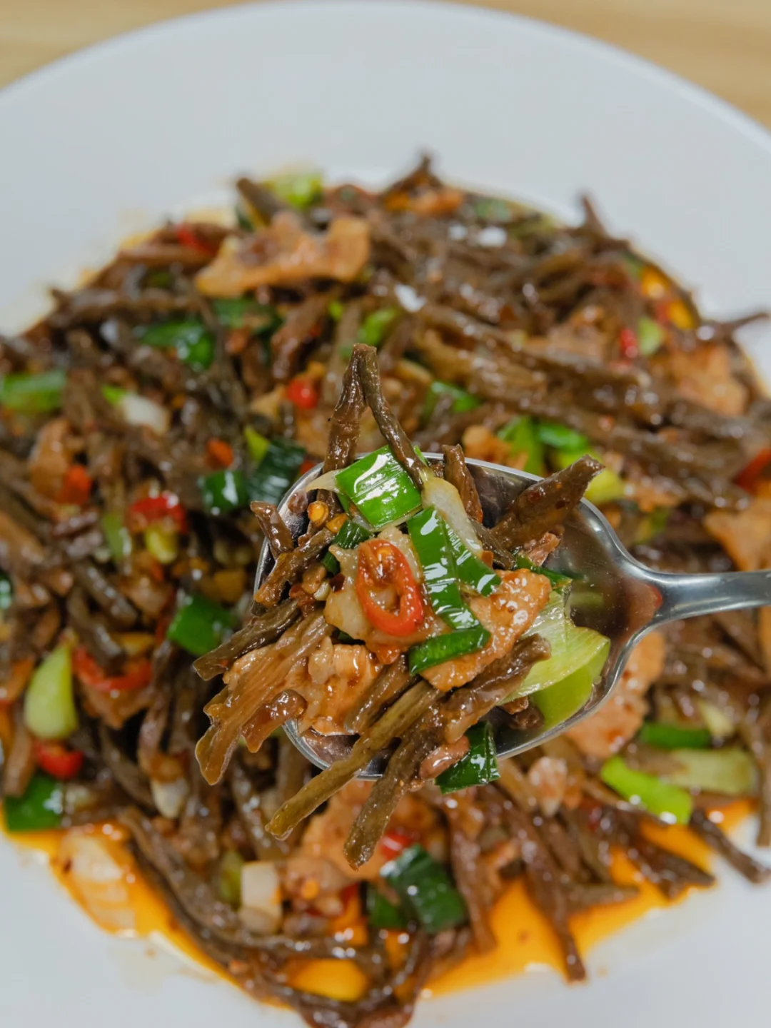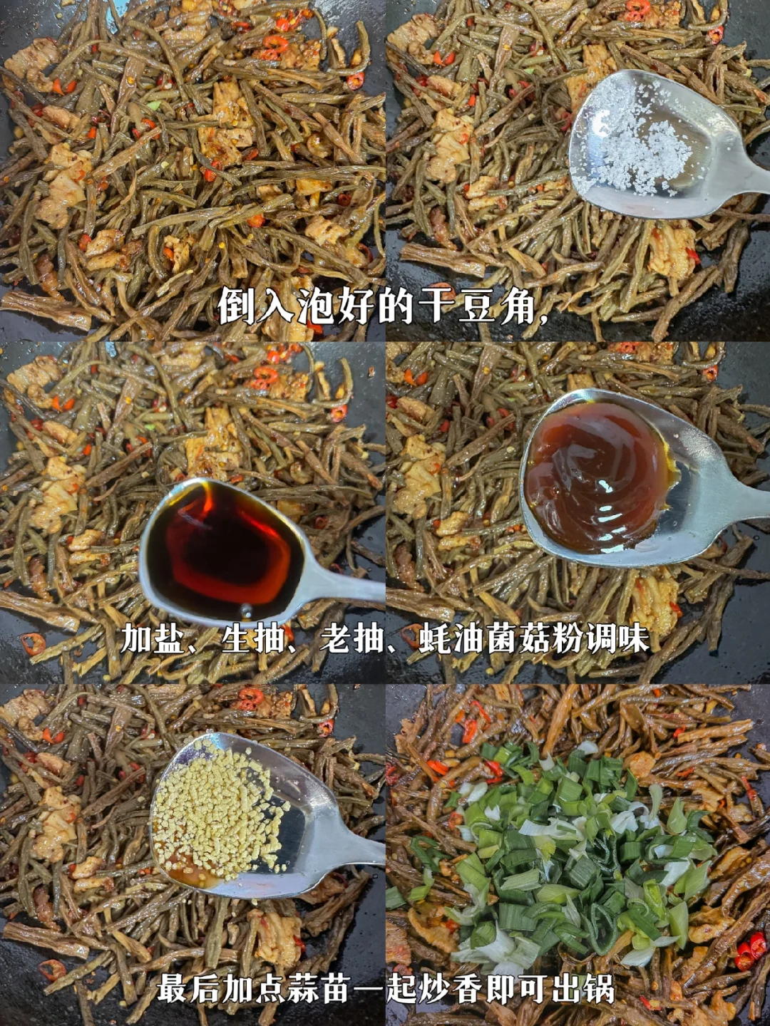 老家寄了干豆角过来,上午到的快递,立马泡发来做这个超级下饭菜,真的好吃到绝!你们一定要多煮点米饭啊! 🥘🥘🥘食材: 干豆角、五花肉、蒜苗、辣椒、蒜末、干辣椒 🌈🌈🌈做法: 1、锅热下油先把五花肉炒至变色,在下备好的蒜末一起炒香。 2、加少许料酒去腥增香和一勺生抽入底味,加入一勺,辣椒粉和辣椒一起爆香 3、倒入泡好的干豆角加少许的盐,生抽,老抽,菌菇粉和蚝油炒香,最后加入蒜苗一起炒香即可出锅 真的比新鲜的豆角好吃很多,特别香,你们一定要试试