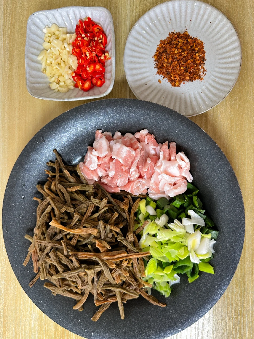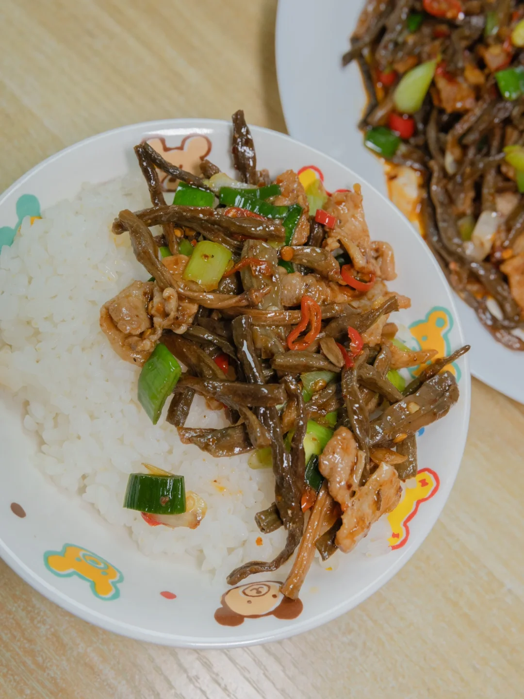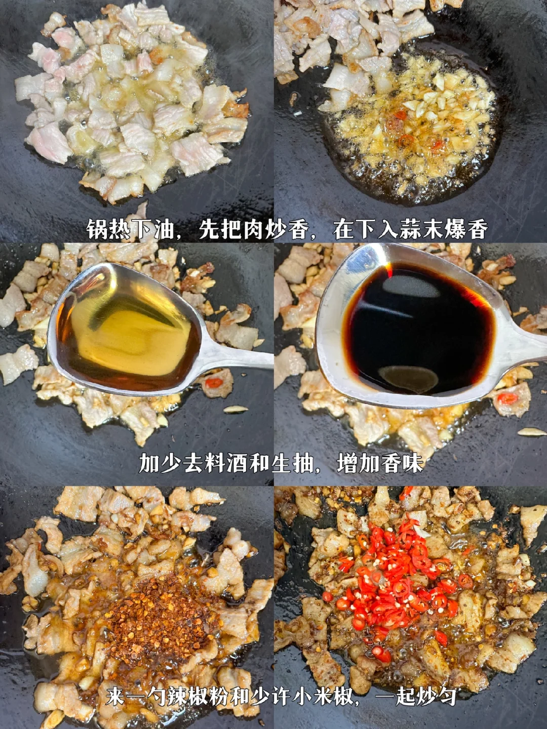 老家寄了干豆角过来,上午到的快递,立马泡发来做这个超级下饭菜,真的好吃到绝!你们一定要多煮点米饭啊! 🥘🥘🥘食材: 干豆角、五花肉、蒜苗、辣椒、蒜末、干辣椒 🌈🌈🌈做法: 1、锅热下油先把五花肉炒至变色,在下备好的蒜末一起炒香。 2、加少许料酒去腥增香和一勺生抽入底味,加入一勺,辣椒粉和辣椒一起爆香 3、倒入泡好的干豆角加少许的盐,生抽,老抽,菌菇粉和蚝油炒香,最后加入蒜苗一起炒香即可出锅 真的比新鲜的豆角好吃很多,特别香,你们一定要试试