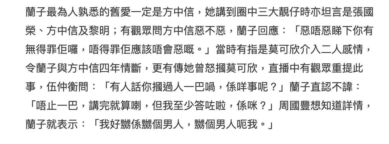 54岁港姐罕谈与方中信旧情,自曝曾掌掴情敌莫可欣,称遭男方欺骗 陈淑兰在访谈中谈及了与前男友方中信的感情,承认曾经掌掴过莫可欣,但她不愿过多谈论,并且称已经放下了。她与方中信分手后火速与祁文杰相恋,但因为性格不合而分开。后来她与利承武相恋12年无果,如今已经分手。陈淑兰已经54岁,表示不适合结婚,享受随遇而安的生活。她表示自己很享受现在的生活,有吃有喝有玩乐。