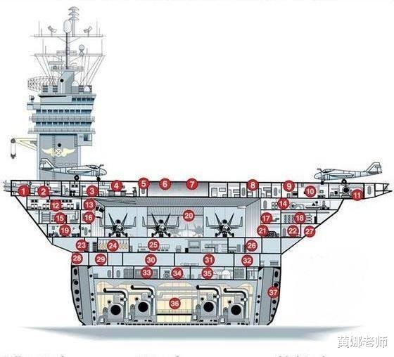 要知道,按照美国核动力航母的总体结构设计,生活区基本都安排在从下往上数的第5、6层。机库则放在更靠上的第9、10层。