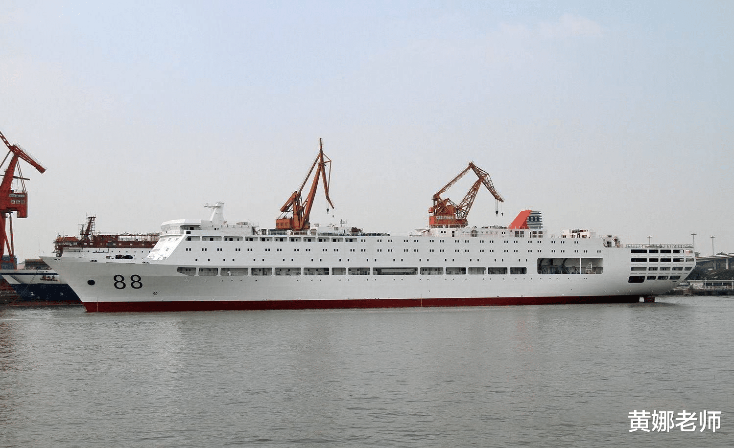 你看,这个外形很像豪华游轮的船舰,就是咱们舷号88的航母训练综合保障舰——“徐霞客”号。