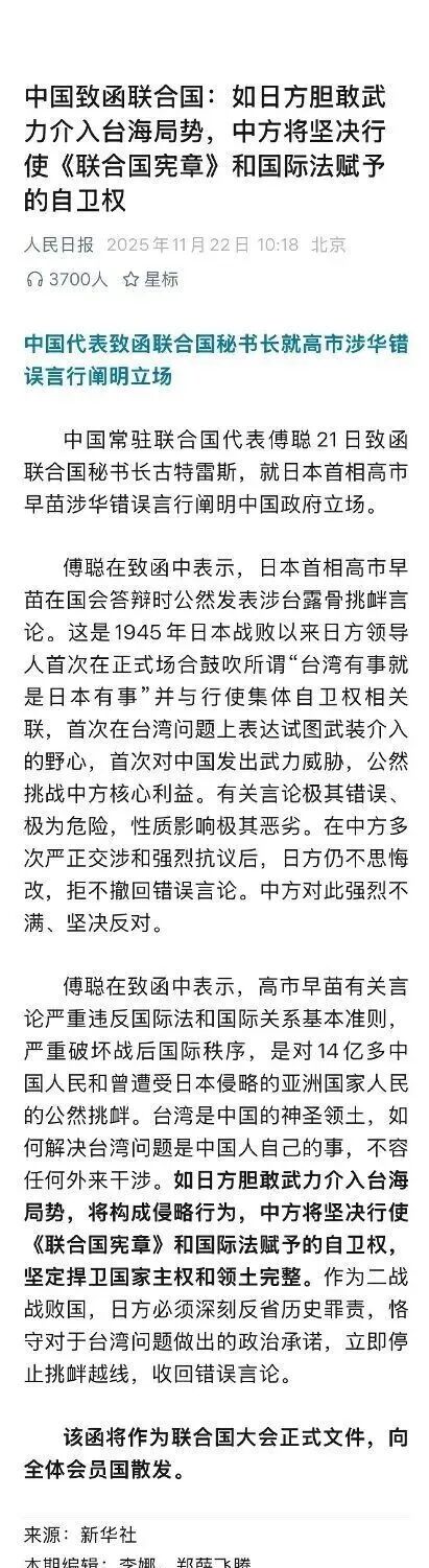 日本首相涉华错误言行引发多方反对,地区稳定受关注 11月21日,中国常驻联合国代表傅聪致函联合国秘书长古特雷斯,就日本首相高市早苗近期涉华错误言行阐明严正立场,强调其言论违反国际法及战后国际秩序基本准则,严重损害地区和平稳定。当晚,日本东京多地爆发民众集会,数千名民众手持"尊重历史事实""停止错误言论"等标语,聚集在首相官邸前抗议,要求高市早苗立即撤回相关言论并公开道歉。国际社会也纷纷发声,韩国外交部发言人在例行记者会上表示,日方言论忽视历史经纬,可能引发地区国家连锁反应;东南亚多国学者联合发表声明,指出日本领导人应汲取历史教训,避免发表激化矛盾的言论。此次事件导致中日外交磋商进程暂时停滞,日本民间对华友好团体表示,首相的不当言论已对两国经贸、文化交流造成负面影响,呼吁政府尽快采取补救措施。