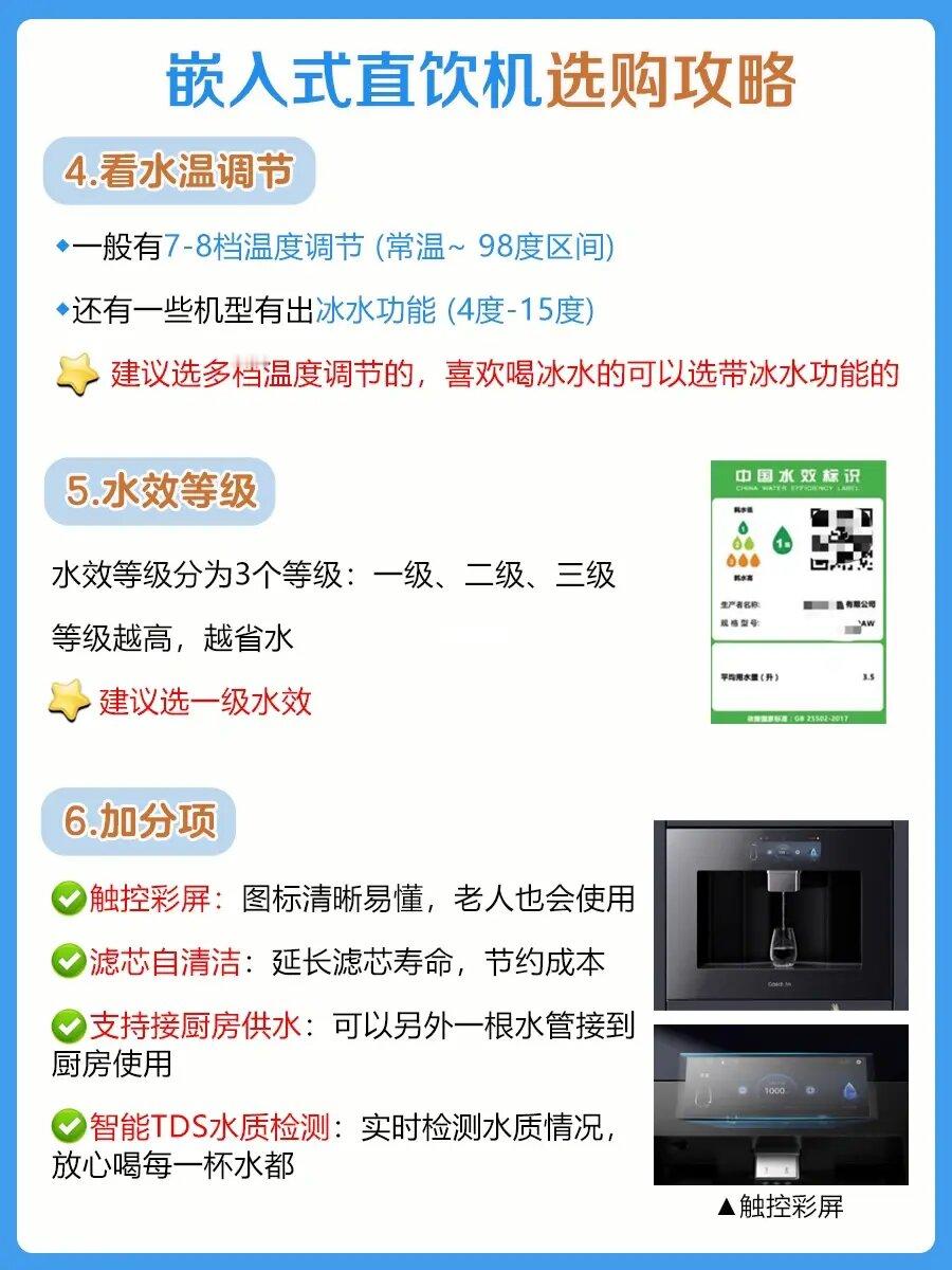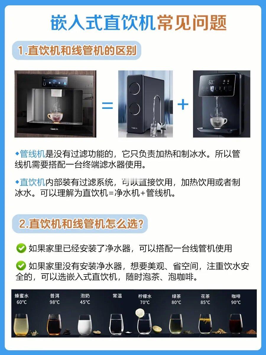 ➡️如果家里没有安装净水器,想要美观、省空间,注重饮水安全的,可以选嵌入式直饮机,随时泡茶、泡咖啡。
