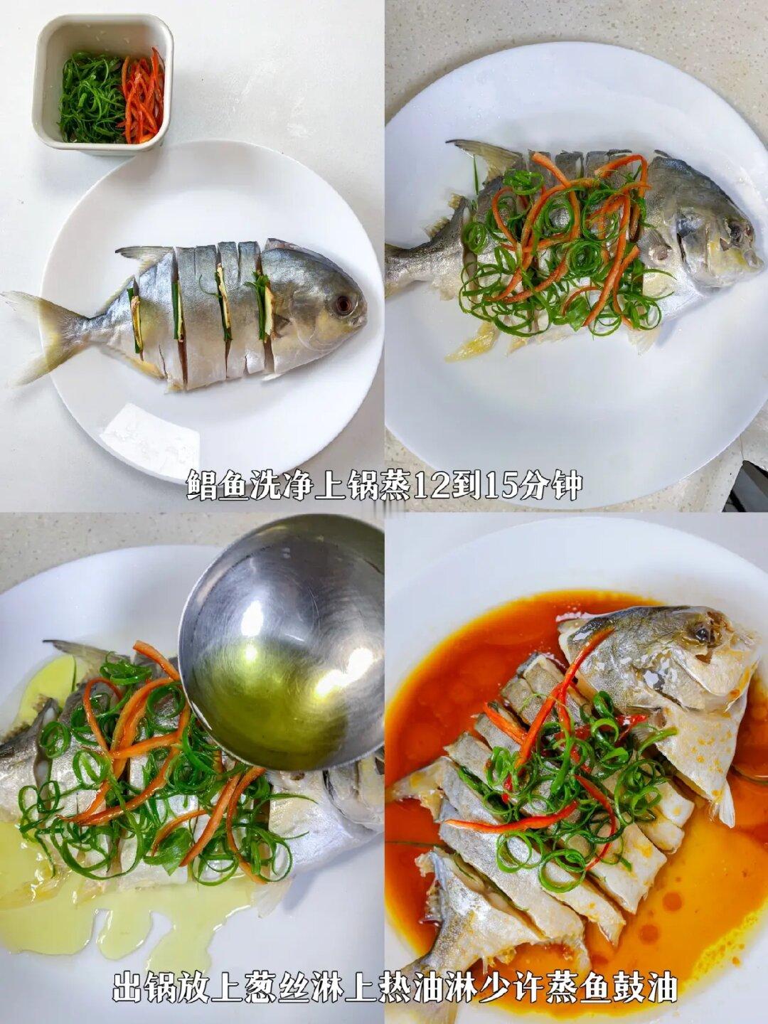 我的天!!!这样蒸出来的鱼真的太太太好吃了 真的超级好吃超级鲜!几分钟就炫完一条鱼! 这个鱼口感细腻鲜美 肉质紧实 一点刺没有 真是老少皆宜 做法也是无敌简单,姐妹们快跟我做起来哟~~ 🌈🌈🌈食材: 鲳鱼、姜片、辣椒 🥘🥘🥘做法: 1、小葱一根、辣椒一个切丝放碗里,再切点葱段、姜备用。 2、鲳鱼洗净划花刀,两面均匀抹上一点点盐,放葱姜腌10分钟。(我买的鲳鱼是切好的) 3、水开上锅大火蒸12-15分钟,取出倒掉蒸出来的汤汁、去掉葱姜,然后放葱丝、辣椒椒丝,淋热油。 4、淋上蒸鱼鼓油即可上桌开吃