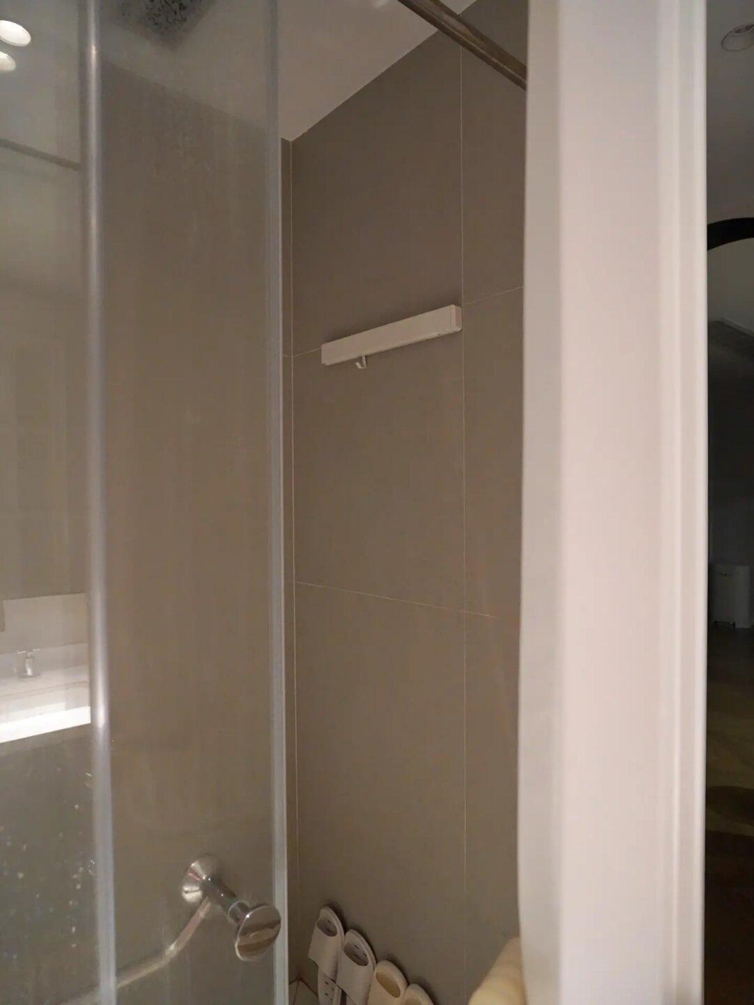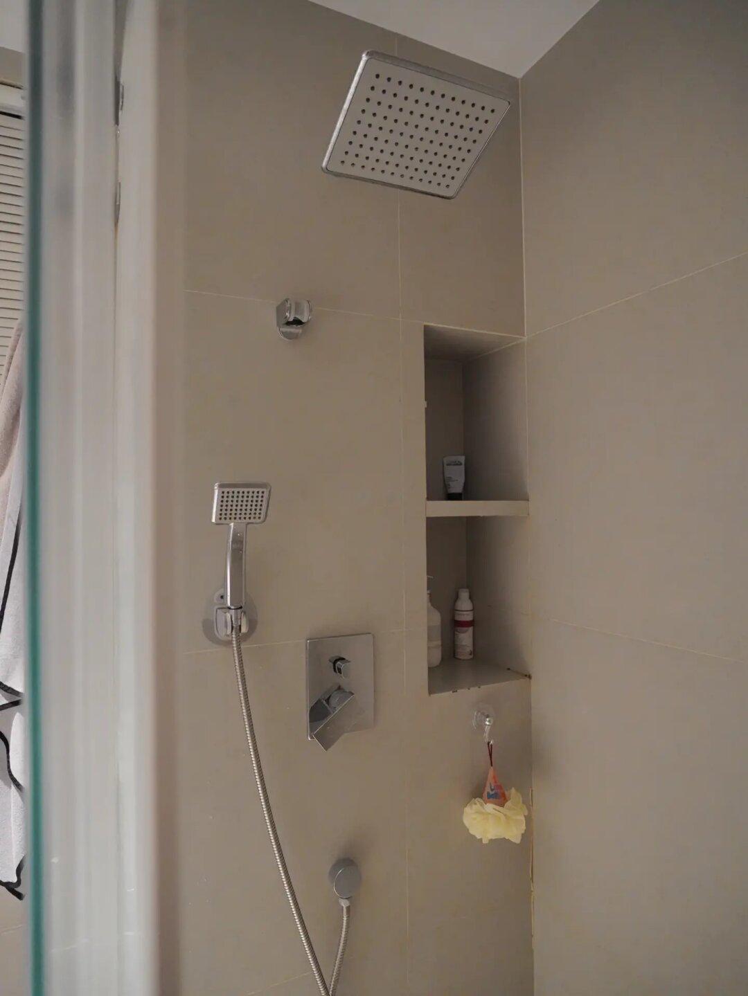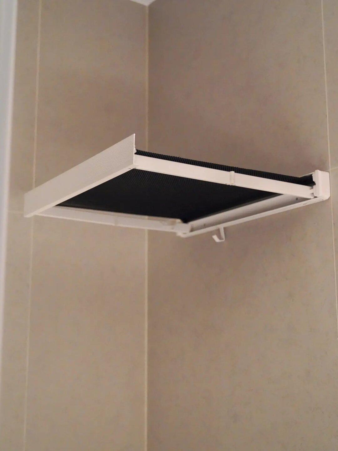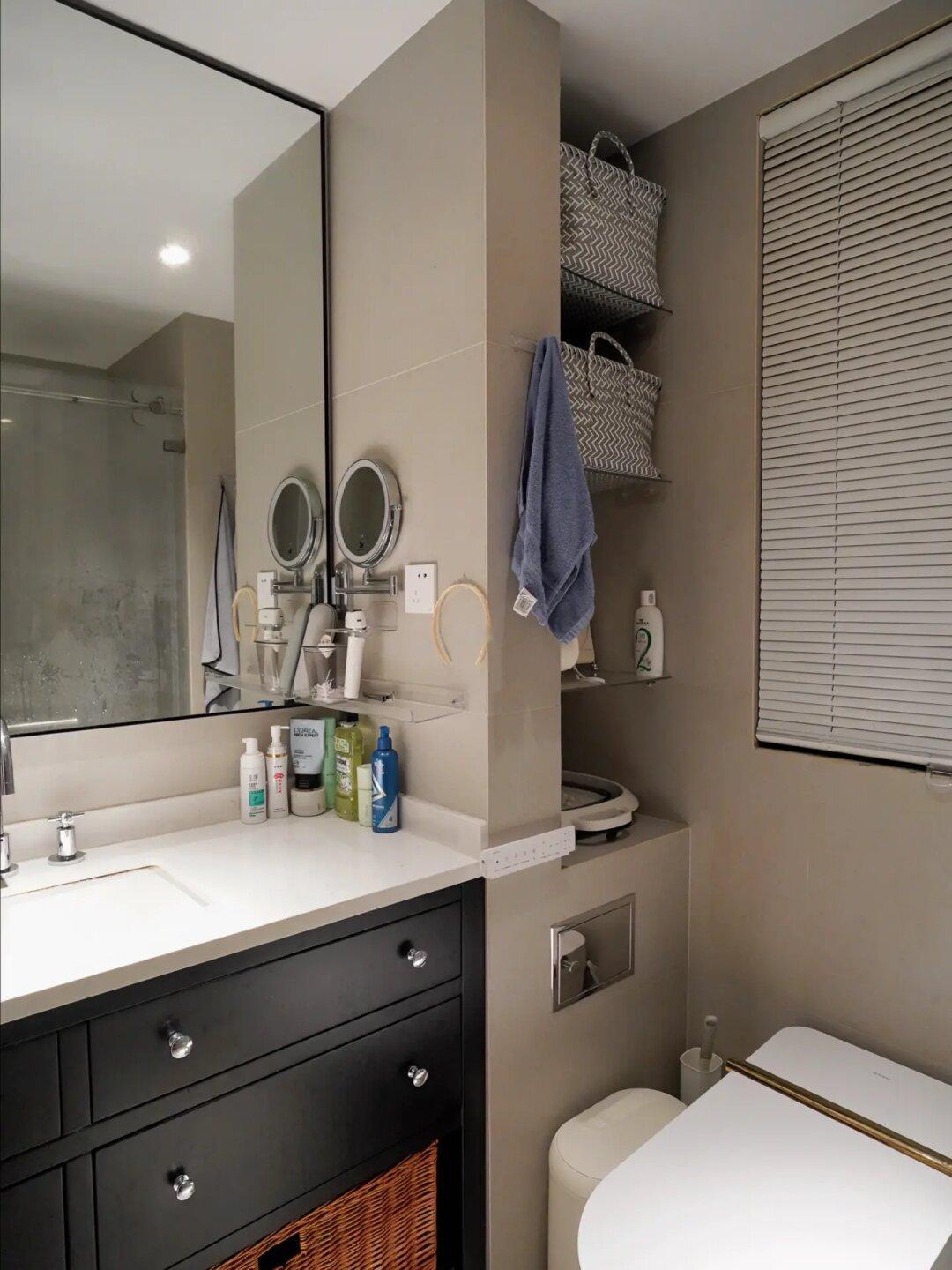 - 不晒可能是因为乱or懒得收拾 平平无奇的卫生间里硬是塞下了收纳和洗漱 P3-淋浴房在门后位置 P4-淋浴房里的折叠置物架 p5-是它打开的样子 P6-嵌入式花洒当时担心容易坏其实也挺好 P7-拍照时乱入的小孩哥 P8-对师傅做的壁龛不满意的我全拆了自己diy了亚克力隔板搭配的置物篮也挺实用 P9-上厕所的时候门外容易蹲着怕我掉马桶🚽的“咕噜”酱