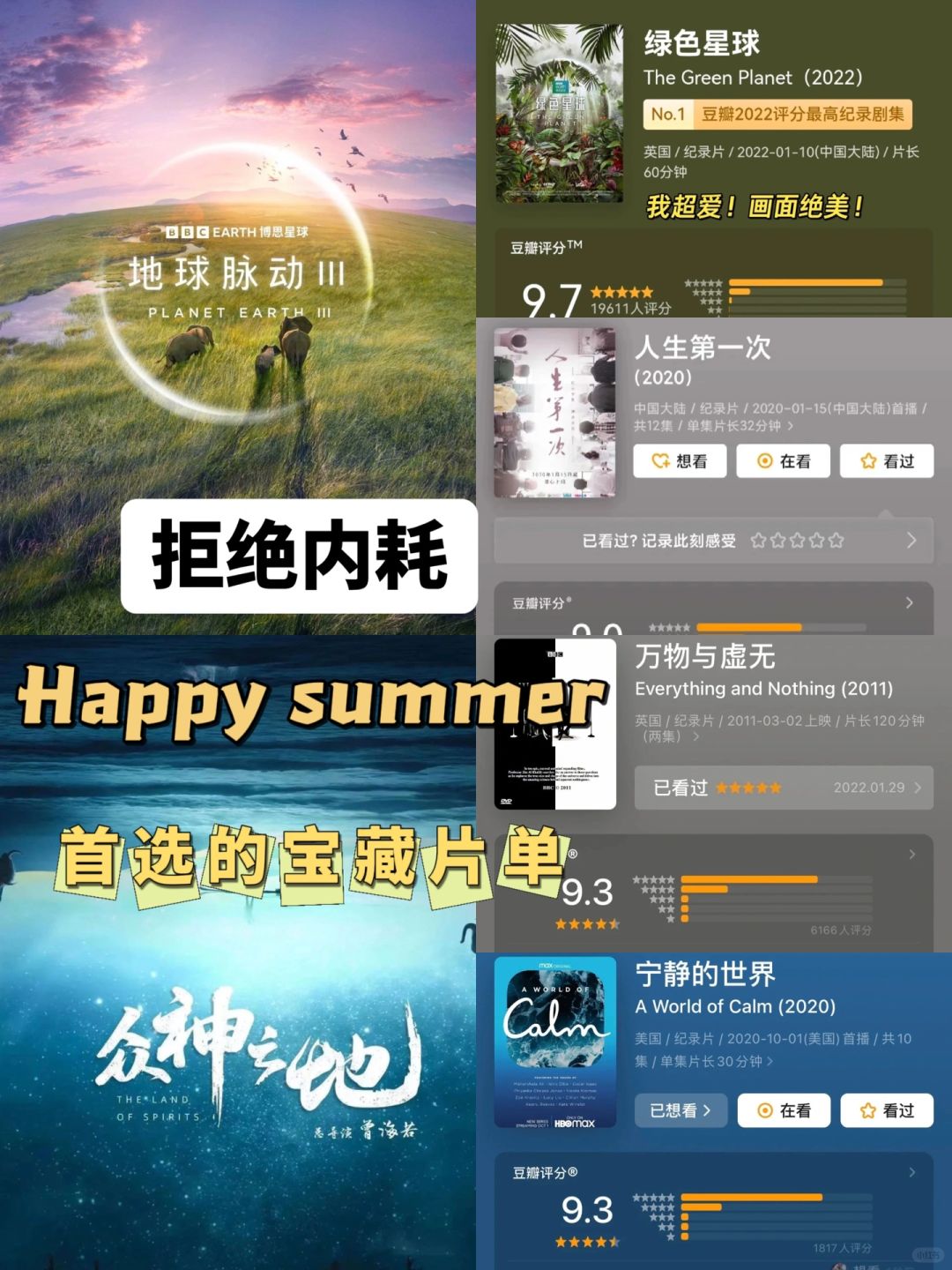 分享几部纪录片:《宁静的世界》《万物与虚无》《绿色星球》《第三极》《众神之地》《人生第一次》《人生第二次》《但是还有书籍》