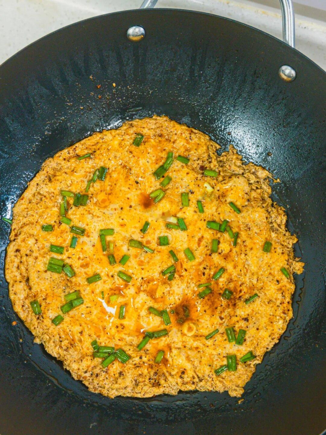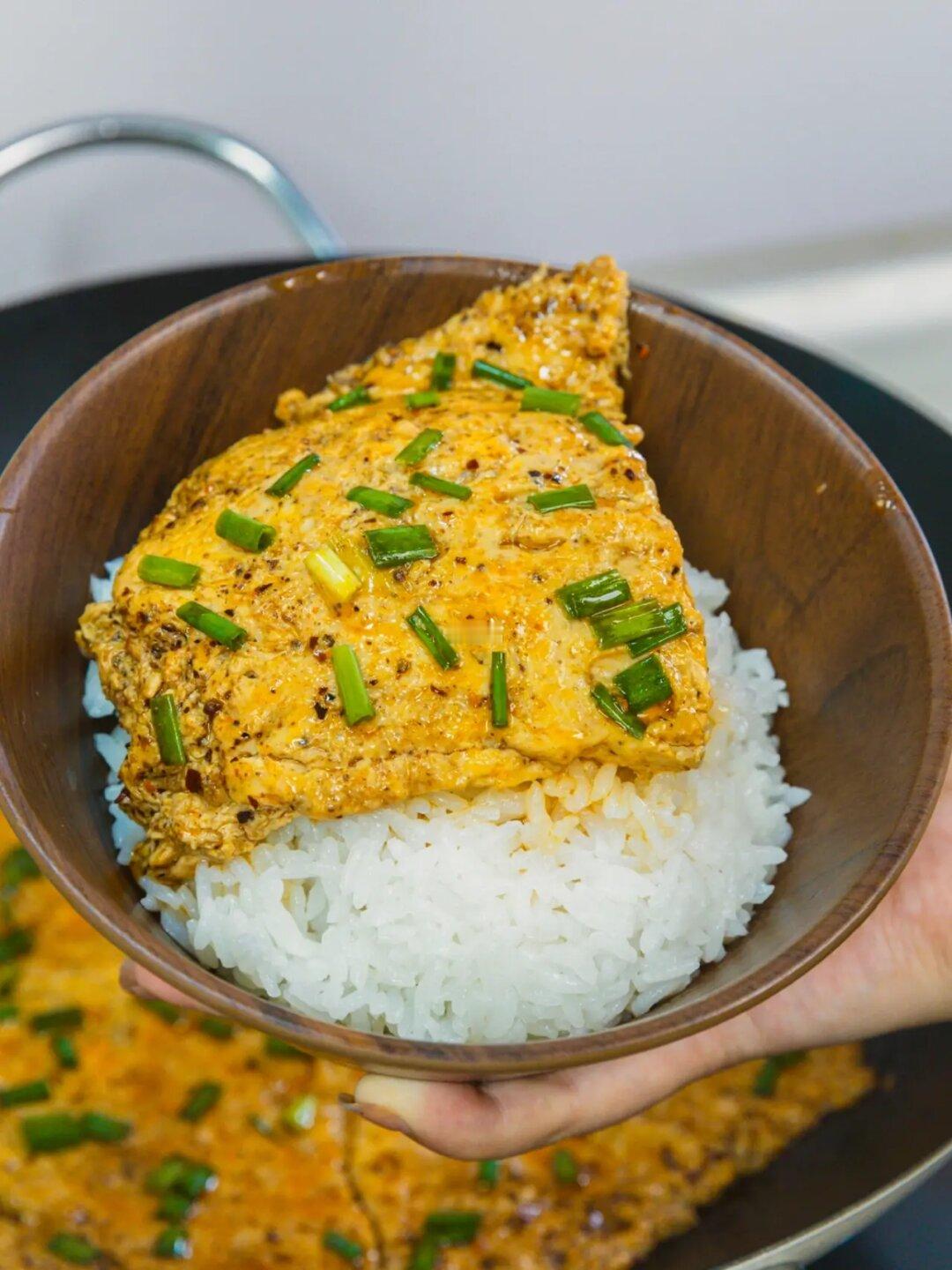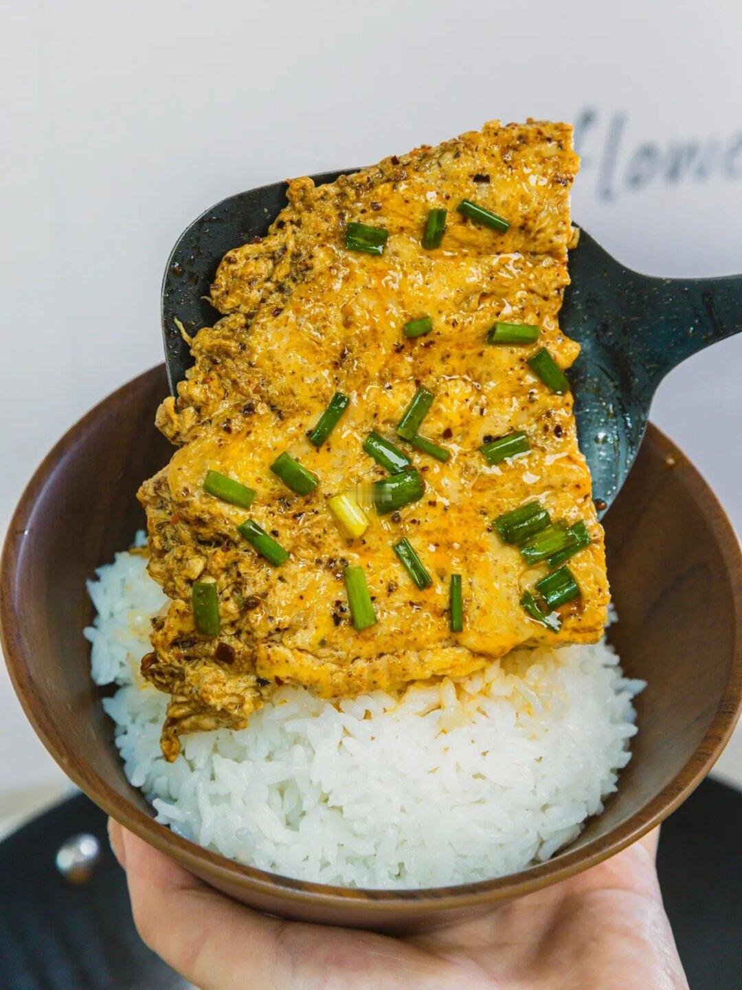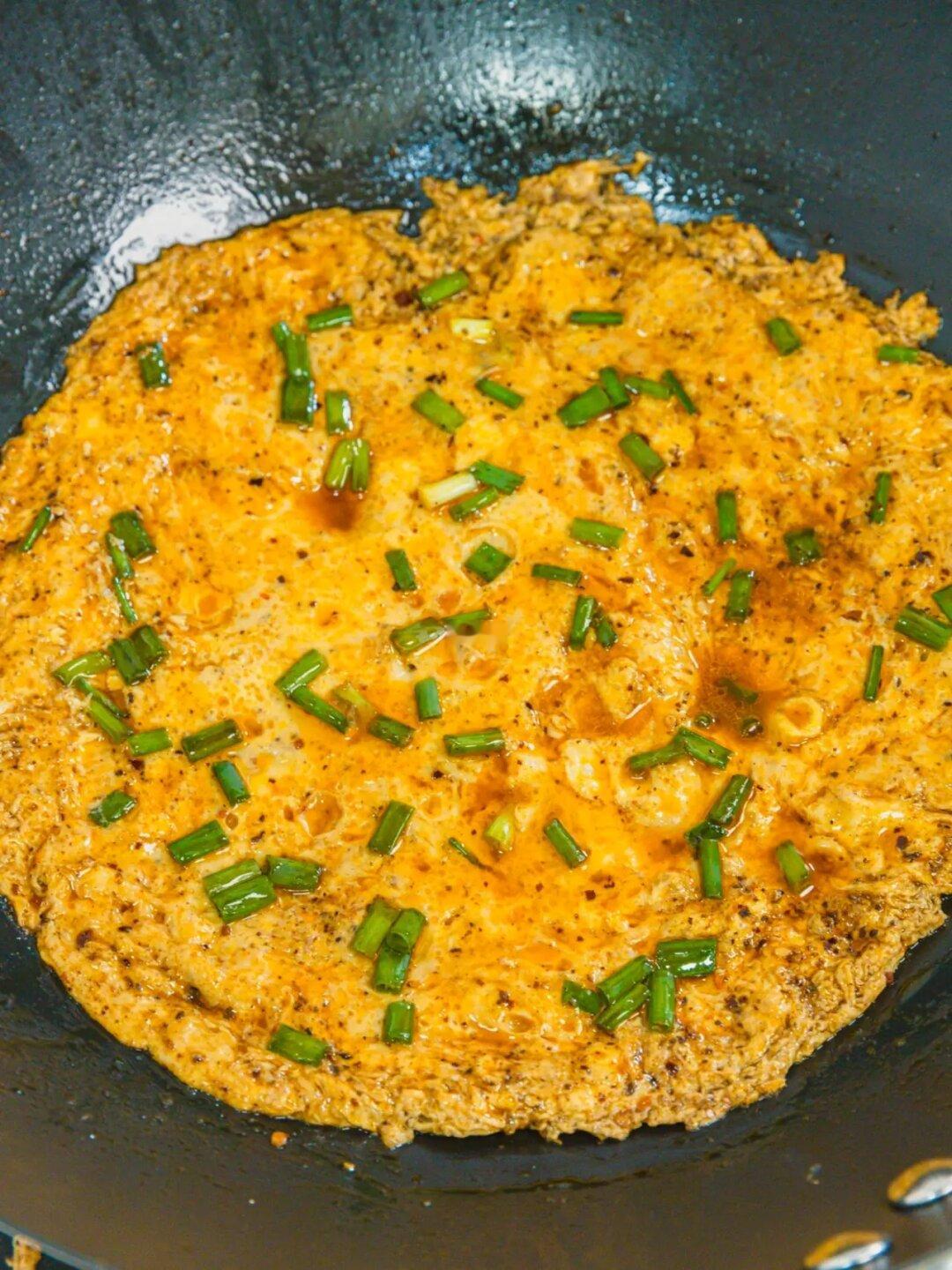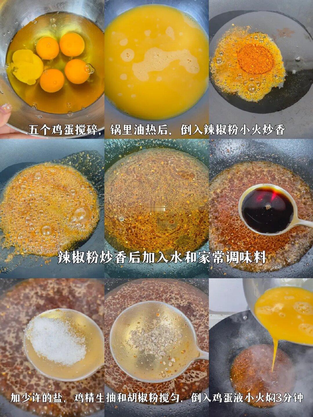 今晚想做个快手菜,就想到了最近大受欢迎的蒸蛋,真没想到这么好吃,又香又嫩,超级合适减脂人士和快手党,五分钟不到就搞定。 🌈🌈🌈食材: 鸡蛋、辣椒粉、葱花 🥘🥘🥘做法: 1、先拿五个鸡蛋,打散备用 2、锅里把油烧热小火倒入辣椒粉炒香,辣椒粉炒香后加入水,再加入少许的盐,鸡粉生抽和胡椒粉调味。 3、把鸡蛋液倒入后开小火盖上盖子焖3分钟即可。
