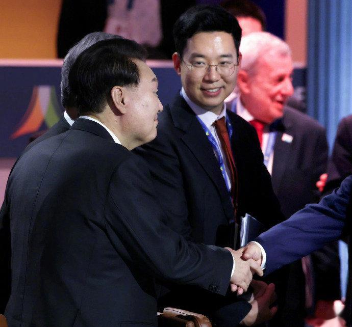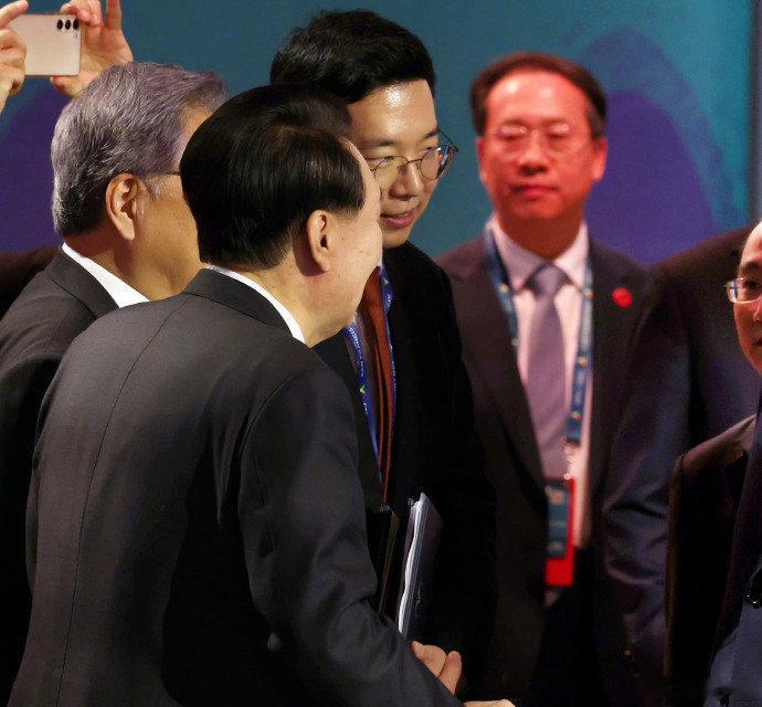旧金山APEC峰会间隙,韩国总统尹锡悦与中方愉快交流。