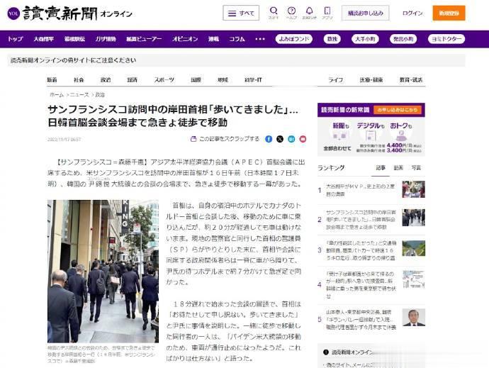 因拜登车队路过封路,岸田文雄被迫下车步行前往与尹锡悦会面,最后迟到18分钟。