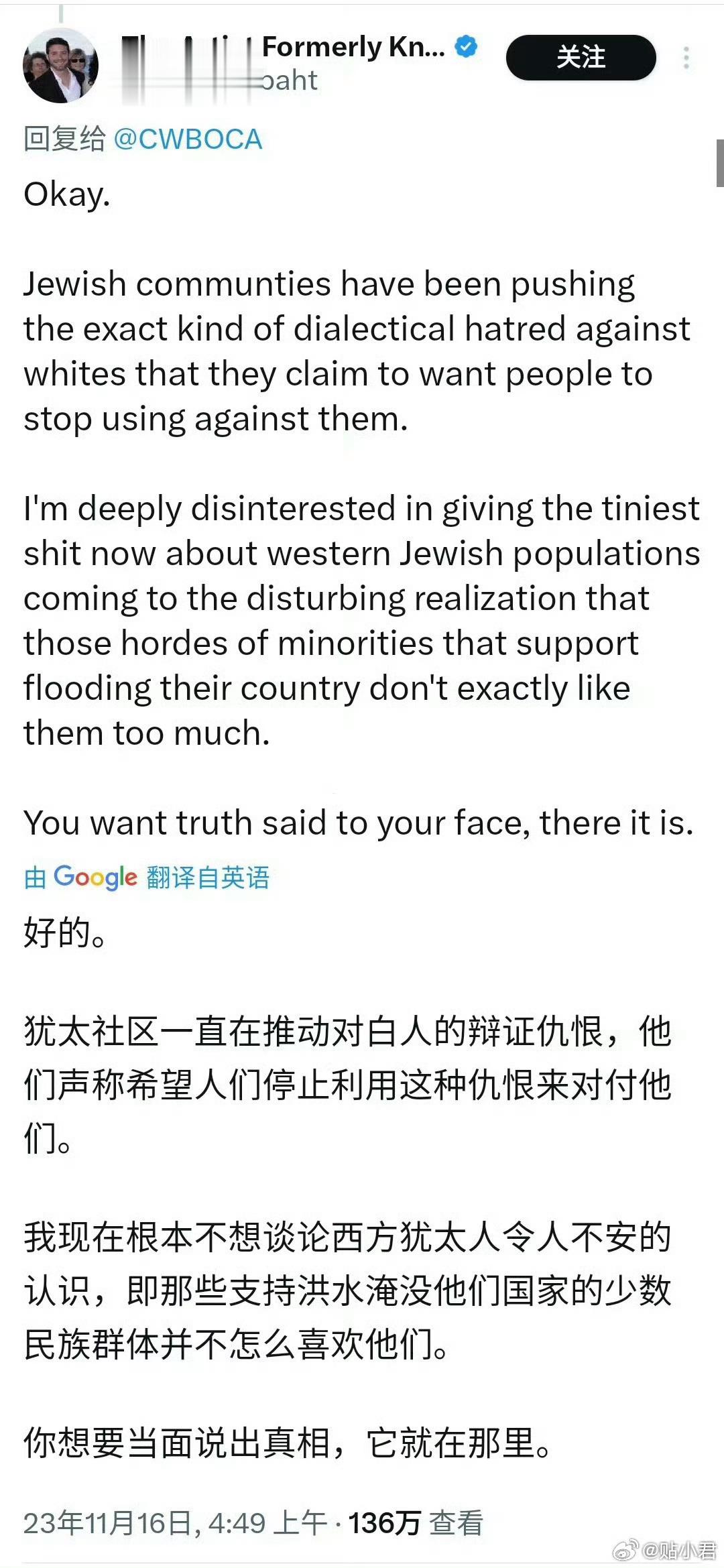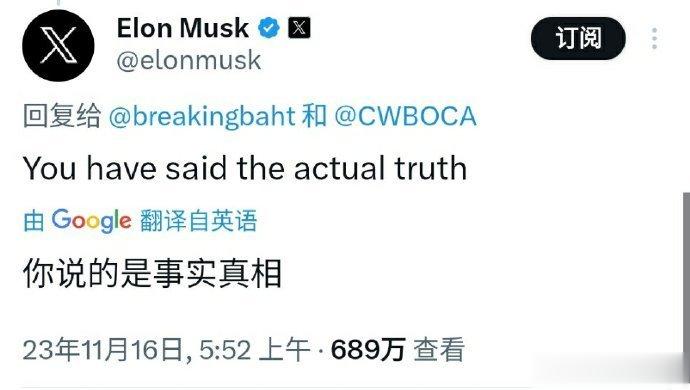 马斯克在社交媒体X上回复一则帖文时对其表示赞同,称其说出了“事实真相”。帖文内容:犹太人正在煽动对白人的仇恨。这则帖文提到的是一种名叫“大替代”的阴谋论,该阴谋论认为犹太人和左翼人士正在企图用非白人移民在种族和文化上取代白人,这将导致“白人种族灭绝”。