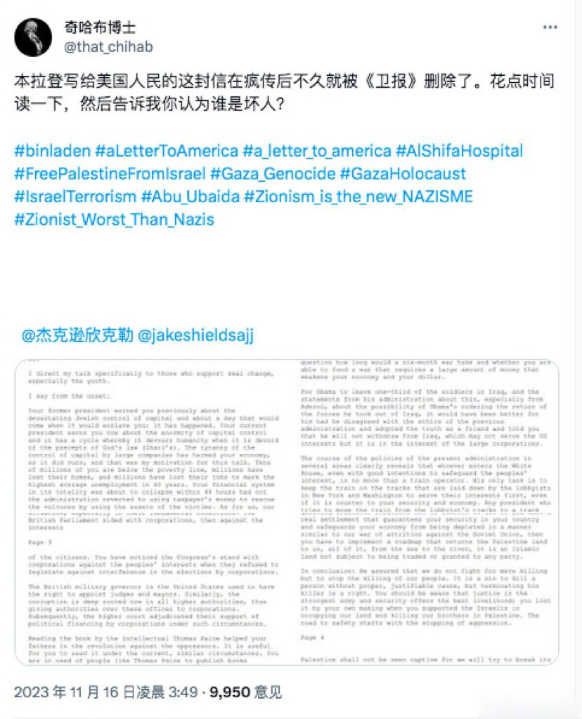 本拉登21年前写给美国人的信,现在在美媒突然火了。TikTok、X、YouTube、Instagram等社交媒体正在重构全球舆论。本·拉登的帖文暴涨4300%。