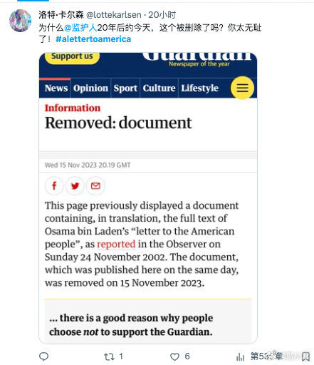 美国人读了21年前的这封“告美国人民书”,纷纷在社交媒体上发表了对本拉登的崇拜之情。之后这封信被网站删除了,但太晚了,已经上了美媒热搜榜。