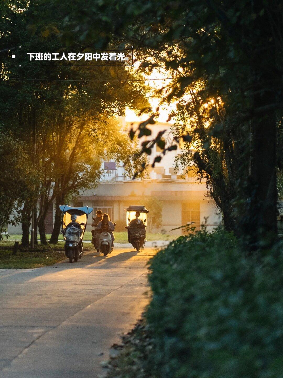 这里一半的厂房工人们还在上班,能隐约听到机器运转的声音,下班的号声一响,下班的队伍骑着电动车在夕阳里鱼贯而出。