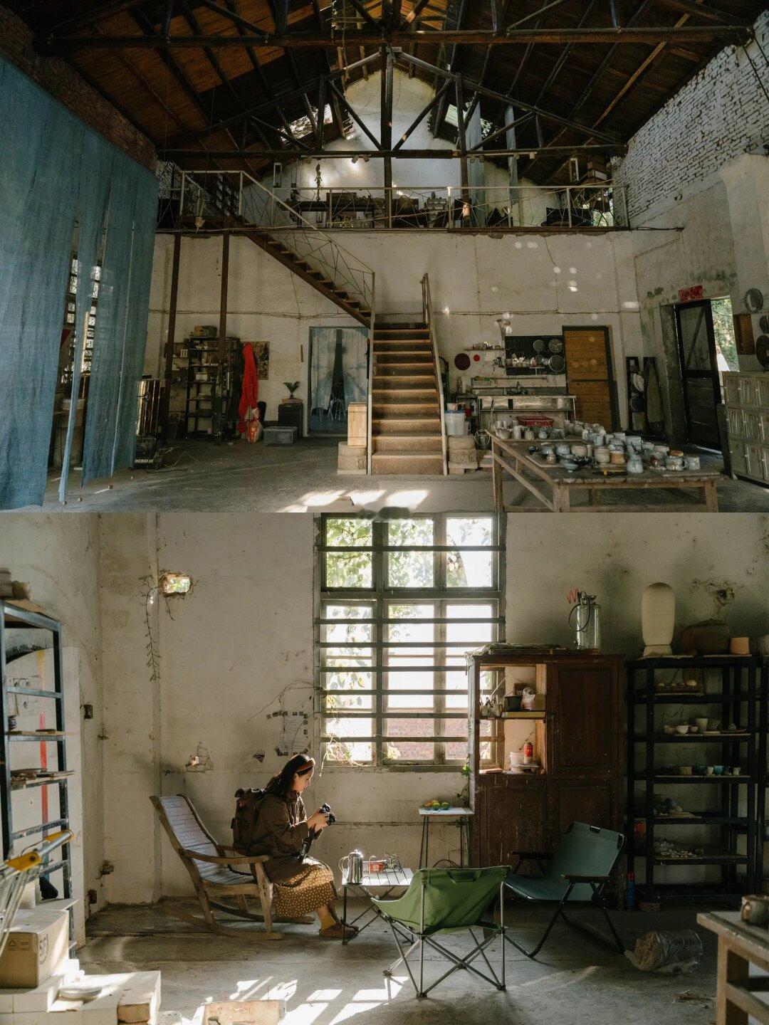 老厂房改造而成的工作室,空间很大,主要是做陶瓷苏打烧。外墙爬满了植物,像是漫画里走出来的房子。