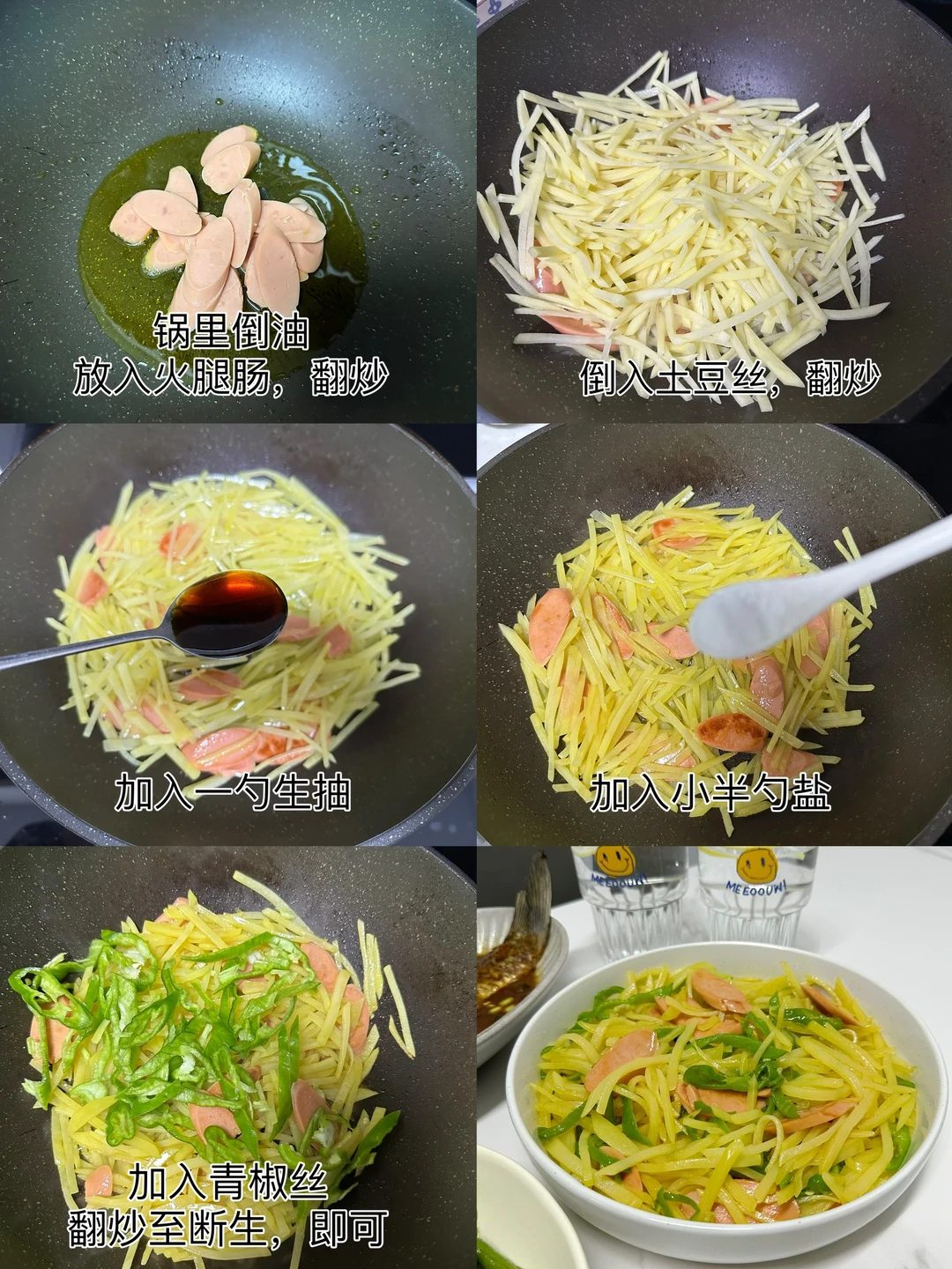 1️⃣锅里倒油,放入火腿肠翻炒,加入土豆丝,加入一勺生抽,翻炒均匀,加入一小勺盐调味
