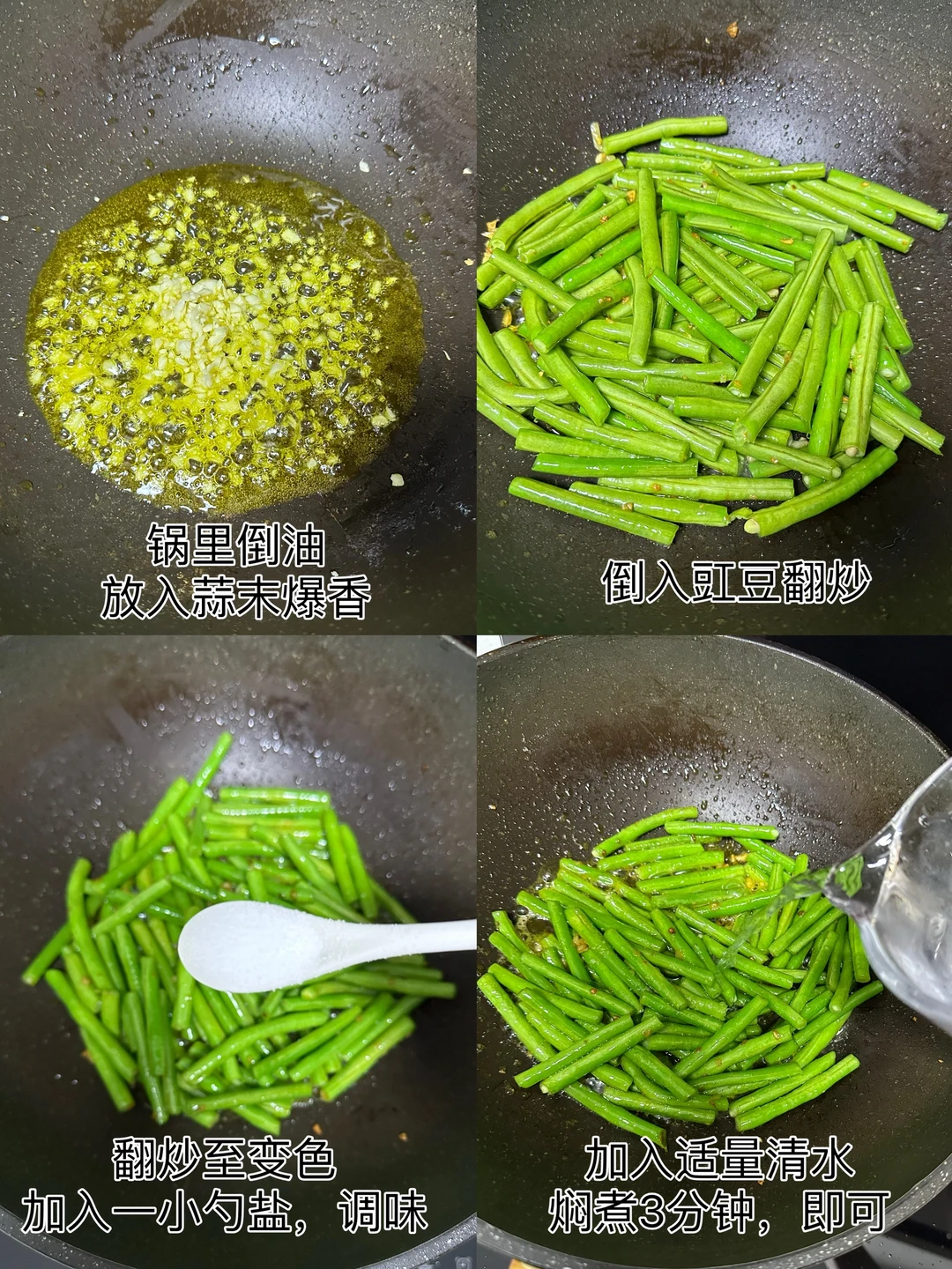 1️⃣锅里倒油,放入蒜末爆香,倒入豇豆翻炒,翻炒至变色,加入一小勺盐调味,加入适量清水,焖煮3分钟即可