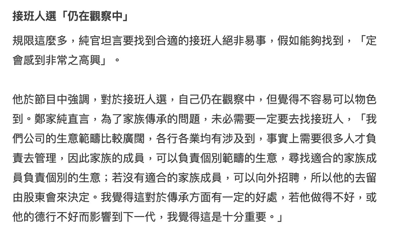 香港76岁第三大富豪罕谈接班人,称仍在观察中,膝下育有五子一女 郑家纯在其持有的HOY TV节目中透露了自己对继承人的看法,认为接班人必须对生意有热情,有领导才能且大公无私,德行更重要。然而,郑家纯并没有明确表示会将家业传给长子郑志刚,他也在观察其他儿子的表现,包括女儿郑志雯。郑家纯的接班人过程比较漫长,他需要在众多儿子中找到最适合的接班人。虽然郑志刚被认为是最合适的,但是郑家纯仍在观察中。