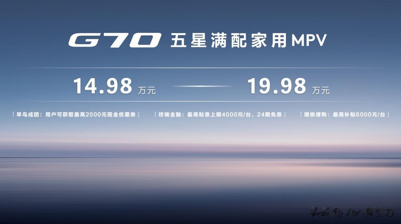 差点忘了说,上汽大通在#2023广州车展# 第二天发布了G70的售价:14.98-19.98万元。对比21.98万起步(车电分离版14.58万)的纯电车大家7,这个价格是不是友好多了? 咱们可以对比一下传祺,插电的E8目前20.98-22.98万,不带侧滑门的M6是11.98-15.98万,而纯油的G70刚好加在它们俩之间,车身尺寸之类硬件参数却直接对标E8,对新能源车没啥特别喜好又割舍不了侧滑门的朋友可以关注一波哟! 对了,G70这车VAN哥前些日子已经测过了,驾乘感受有小惊喜。不过这不是正好赶上车展么,评测视频没来得及上线,只能再拖几天了,稍安勿躁……#2023广州车展# #MPV#