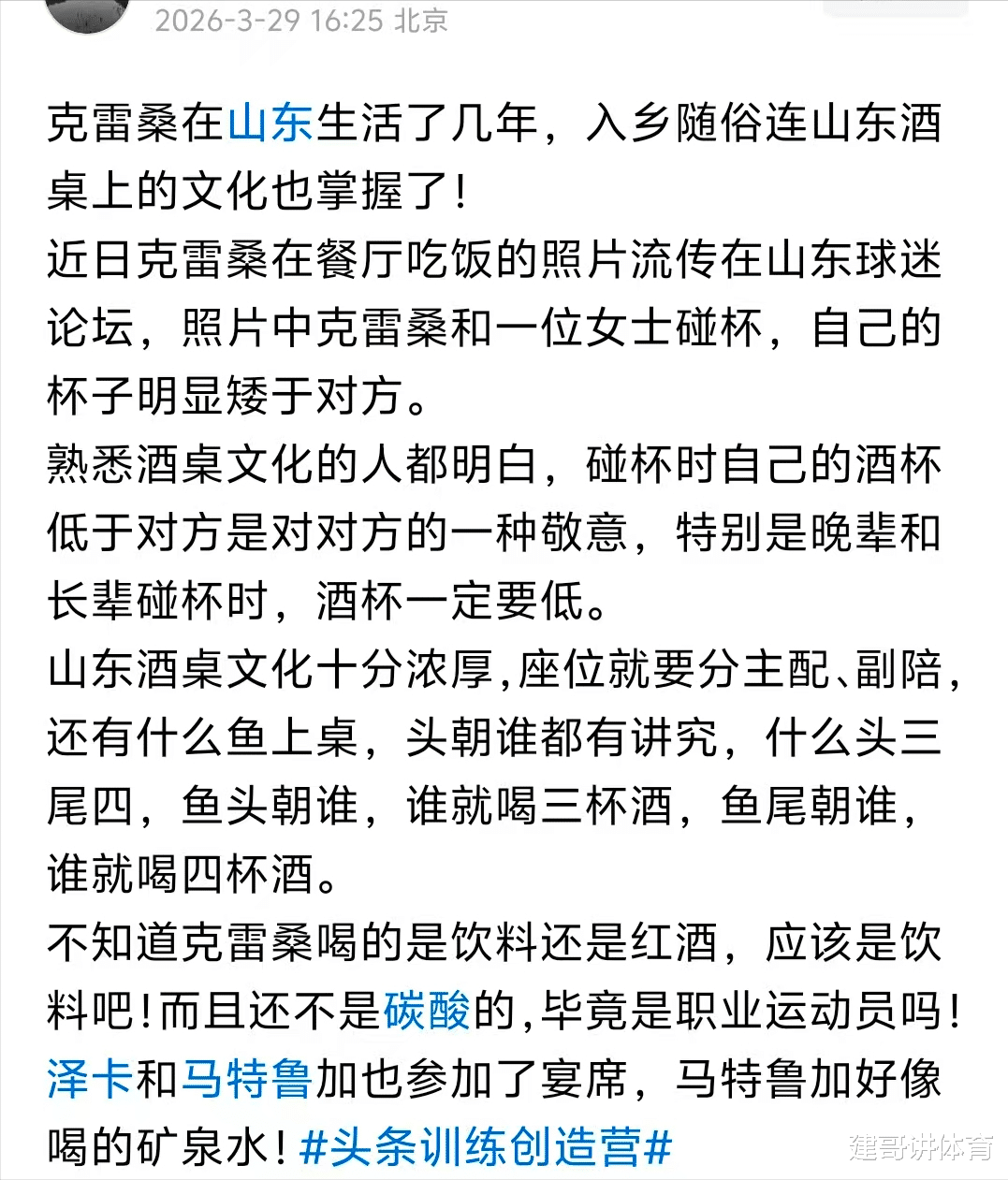 当京媒率先对泰山队当家外援克雷桑休假期间的活动进行了报道后,不知道遭遇质疑的克雷桑,会不会对这次和泽卡、马德鲁加的聚餐进行解释,看来职业球员还是不要和带颜色的饮料为好,假如他们喝的都和马德鲁加一样的白开水,就不会出现京媒这篇质疑的文章 了。