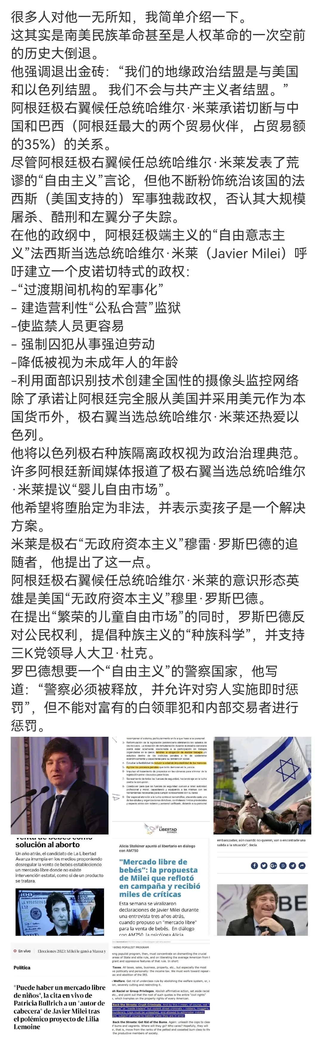 说实话,看了阿根廷总统米莱最新的发言,再结合他主张的各种激进政策,我认为未来整个南美洲的地缘政治恶化将是一个大概率事件。