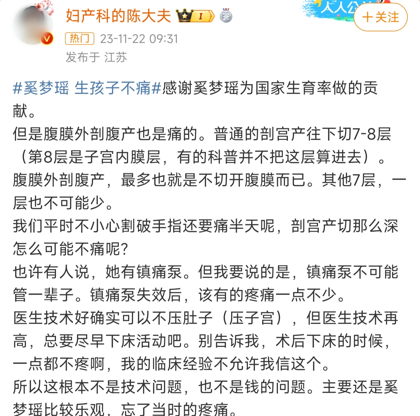 生孩子不痛,奚梦瑶言论引发热议,评论区炸了专业医生现身辟谣 奚梦瑶在节目中称生孩子时打麻药就疼一下,但生完后麻药过了会很疼。网友认为她在误导大众,但也有人表示她有金钱保障和更好的医疗条件。妇产科医生分析,生孩子不疼主要是因为医疗设备和医生技术好。奚梦瑶之所以说不痛,可能是因为她对生孩子感到快乐,忘记了当时的疼痛。她的幸福生活也与金钱无关。