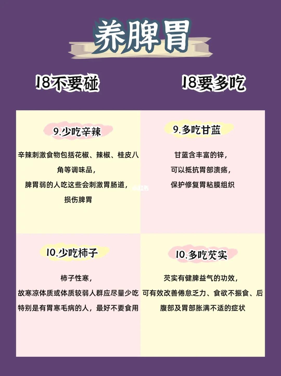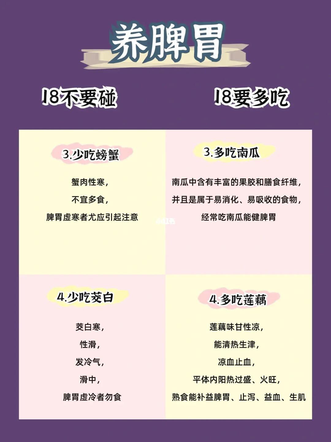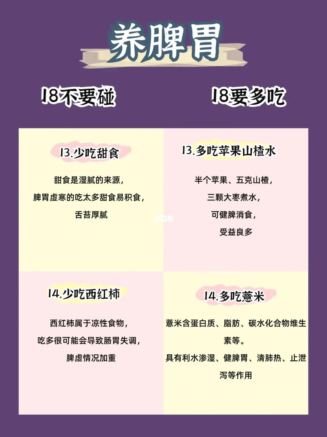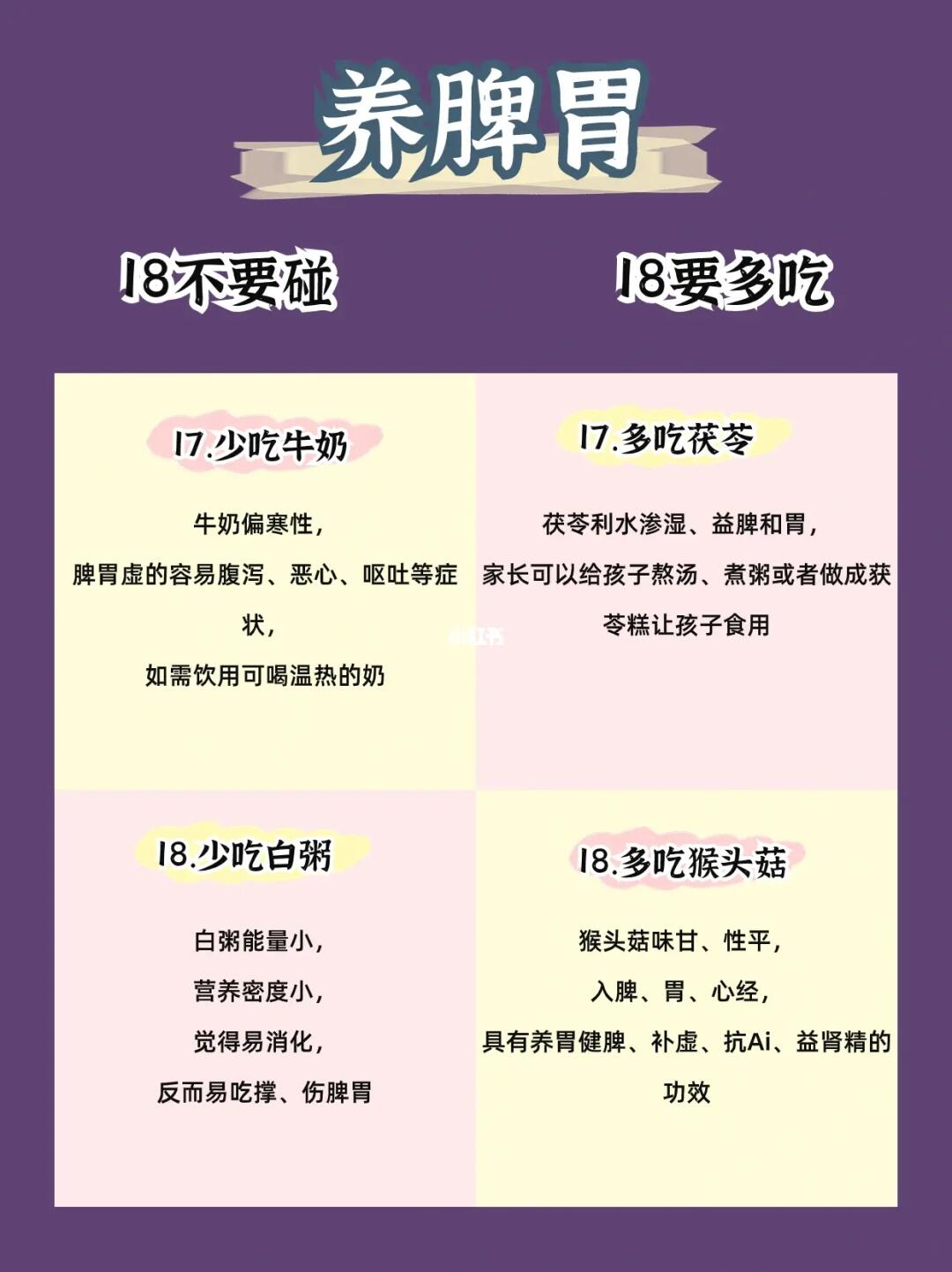 18不要碰 ❌少吃枸杞 ❌少吃茄子 ❌少吃螃蟹 ❌少吃茭白 ❌少吃绿豆 ❌少吃冷饮 ❌少吃硬食 ❌少吃土豆 ❌少吃辛辣食物 ❌少吃柿子 ❌少吃火龙果 ❌少吃油炸物 ❌少吃甜食 ❌少吃西红柿 ❌少吃烧烤 ❌少吃西瓜 ❌少吃牛奶 ❌少吃白粥 18要多吃 ✅多吃猪肚 ✅多吃银耳 ✅多吃南瓜 ✅多吃莲藕 ✅多吃白萝卜 ✅多吃粗粮 ✅多吃红枣 ✅多吃山药 ✅多吃甘蓝 ✅多吃芡实 ✅多吃小米 ✅多吃胡萝卜 ✅多吃苹果山楂水 ✅多吃薏米 ✅多吃牛肉 ✅多吃莲子 ✅多吃茯苓 ✅多吃猴头菇