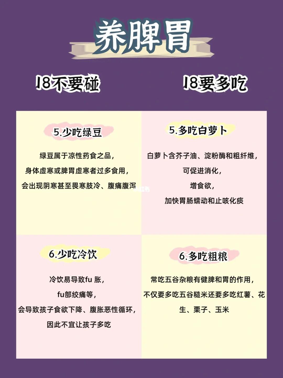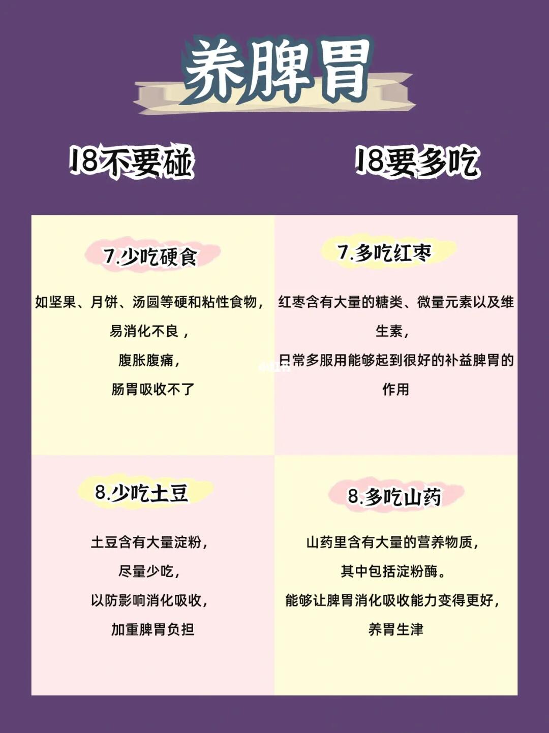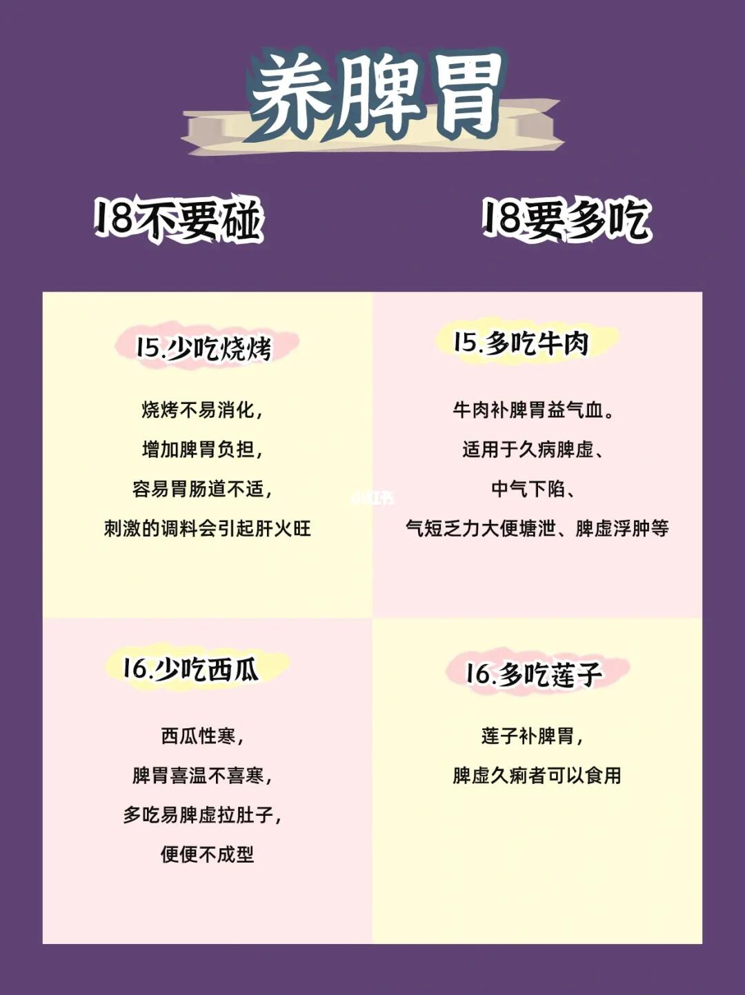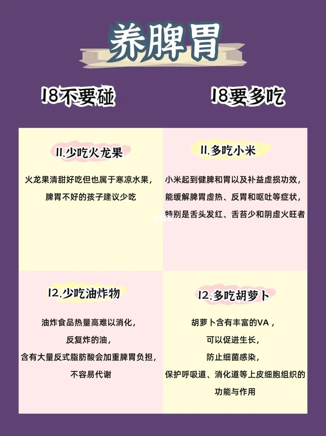 18不要碰 ❌少吃枸杞 ❌少吃茄子 ❌少吃螃蟹 ❌少吃茭白 ❌少吃绿豆 ❌少吃冷饮 ❌少吃硬食 ❌少吃土豆 ❌少吃辛辣食物 ❌少吃柿子 ❌少吃火龙果 ❌少吃油炸物 ❌少吃甜食 ❌少吃西红柿 ❌少吃烧烤 ❌少吃西瓜 ❌少吃牛奶 ❌少吃白粥 18要多吃 ✅多吃猪肚 ✅多吃银耳 ✅多吃南瓜 ✅多吃莲藕 ✅多吃白萝卜 ✅多吃粗粮 ✅多吃红枣 ✅多吃山药 ✅多吃甘蓝 ✅多吃芡实 ✅多吃小米 ✅多吃胡萝卜 ✅多吃苹果山楂水 ✅多吃薏米 ✅多吃牛肉 ✅多吃莲子 ✅多吃茯苓 ✅多吃猴头菇