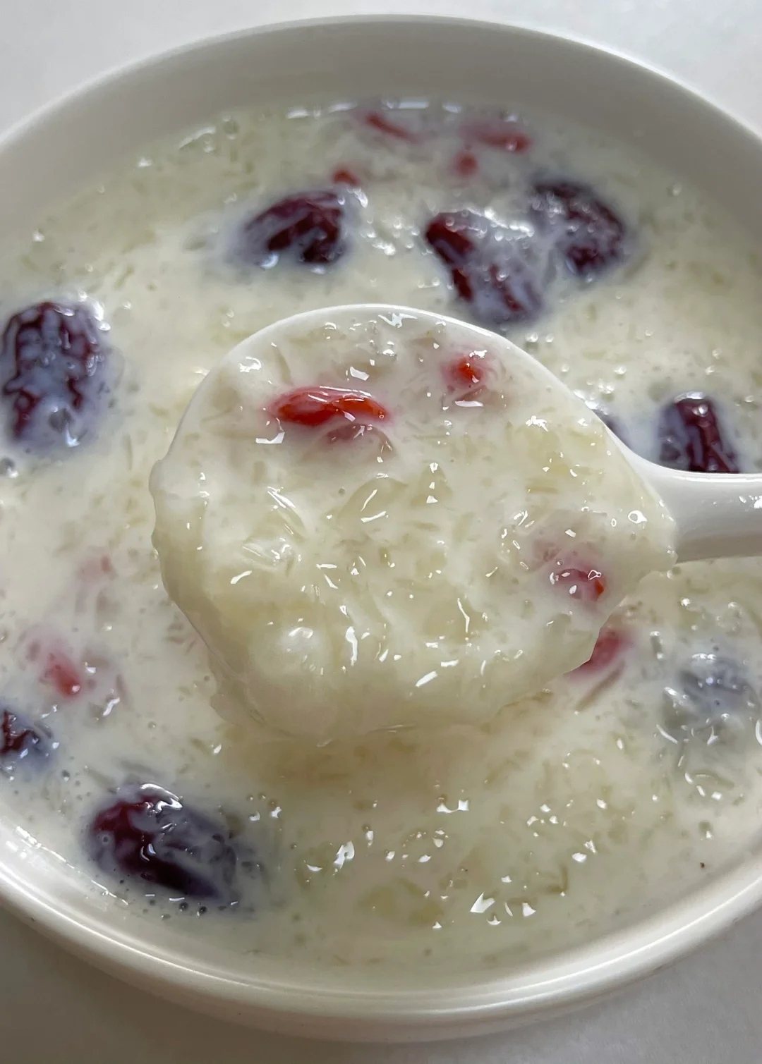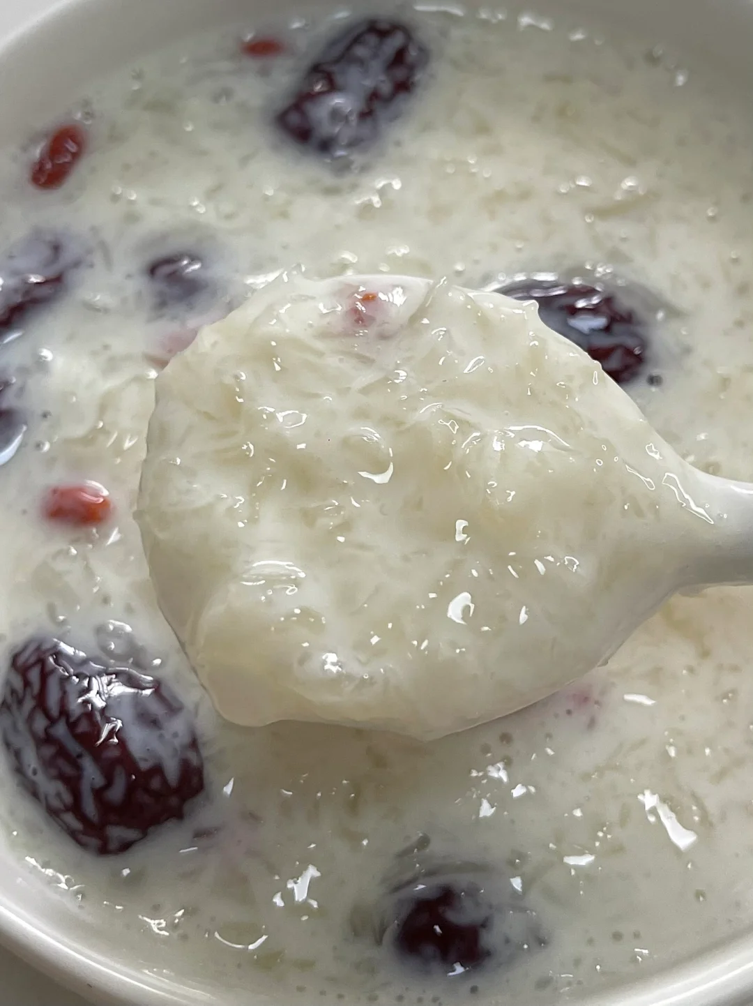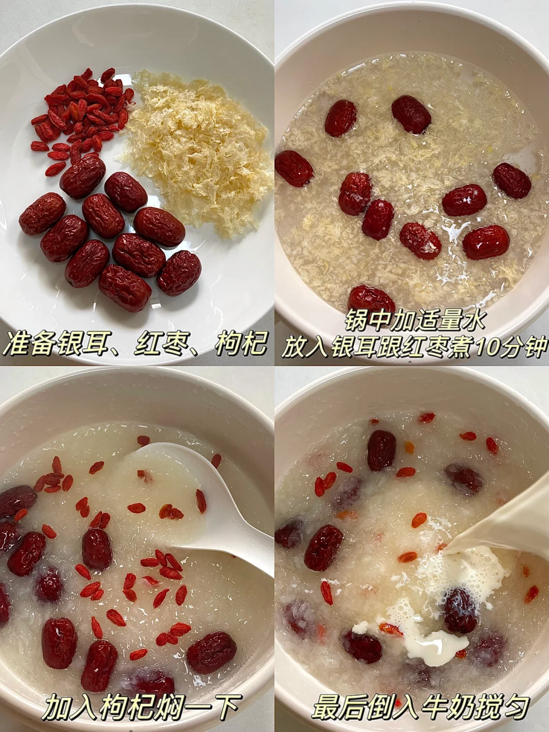 我妈说喝这个抵十张面膜! 做法超简单~养颜还低卡! 浓浓的奶香味搭配上淡淡清甜味的红枣 真的好好喝! 女孩子要多喝汤汤水水的皮肤才会水嫩哦~ - 食材:银耳 红枣 枸杞 牛奶 ☑️红枣银耳加冷水下锅 焖煮十分钟 ☑️加入枸杞再焖2分钟 ☑️倒入牛奶 搅匀开喝~