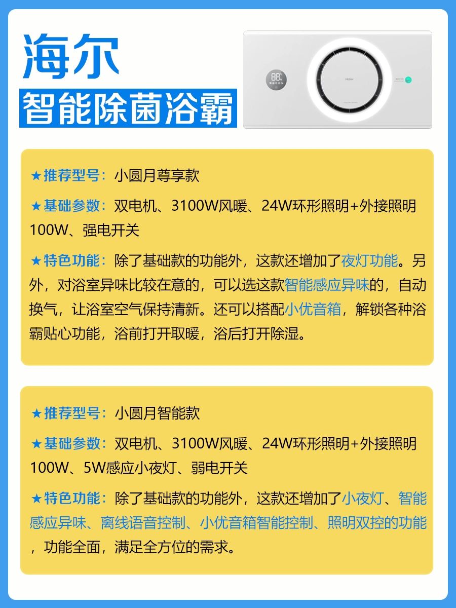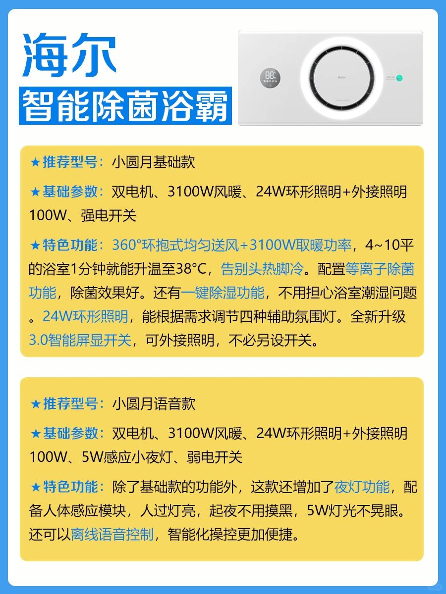 😎推荐海尔的智能除菌浴霸,小圆月尊享款1k出头,360°环抱式均匀送风+3100W取暖功率,24W环形照明+四种辅助氛围灯,取暖、照明配置都很够用,还配备除湿、除菌功能,性价比超高。