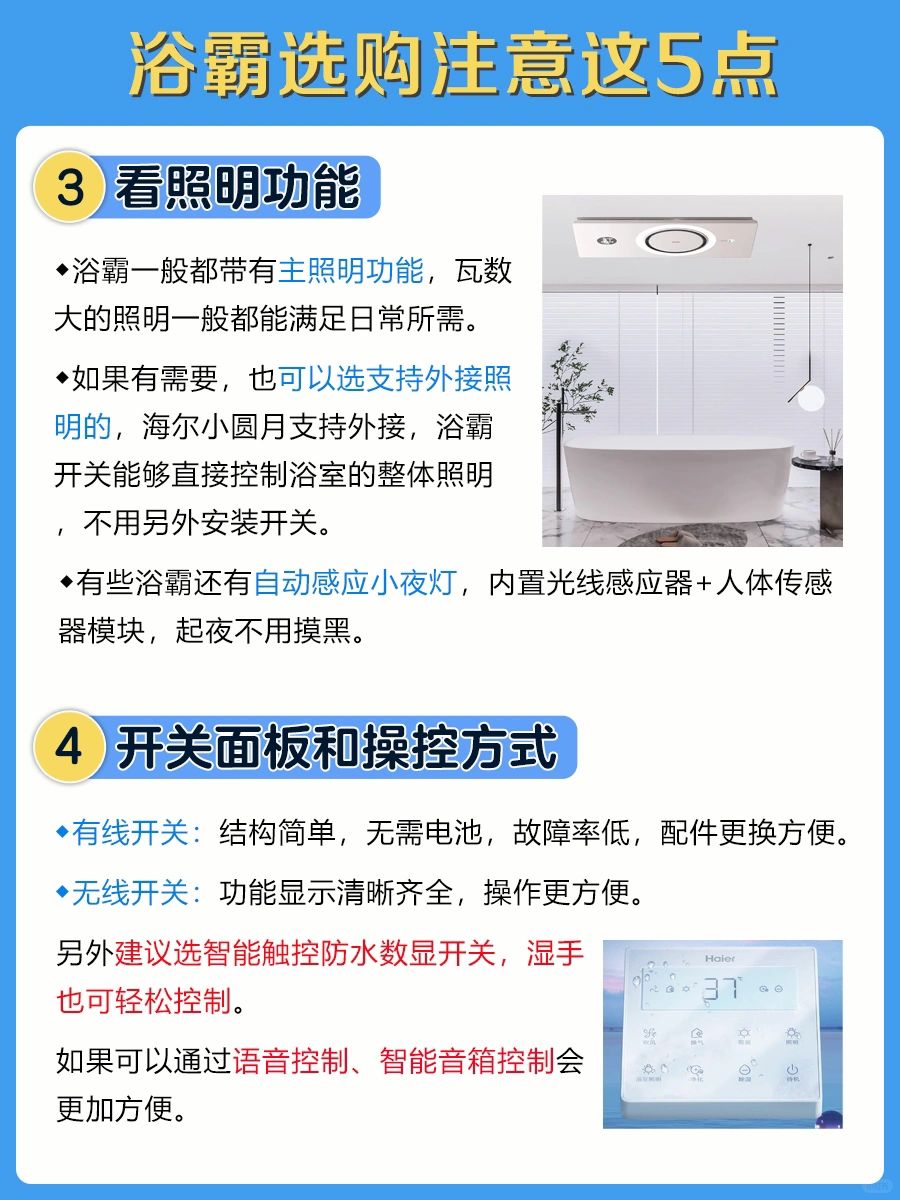 如果有需要,也可以选支持外接照明的,海尔小圆月支持外接,浴霸开关能够直接控制浴室整体照明,不用另外装开关