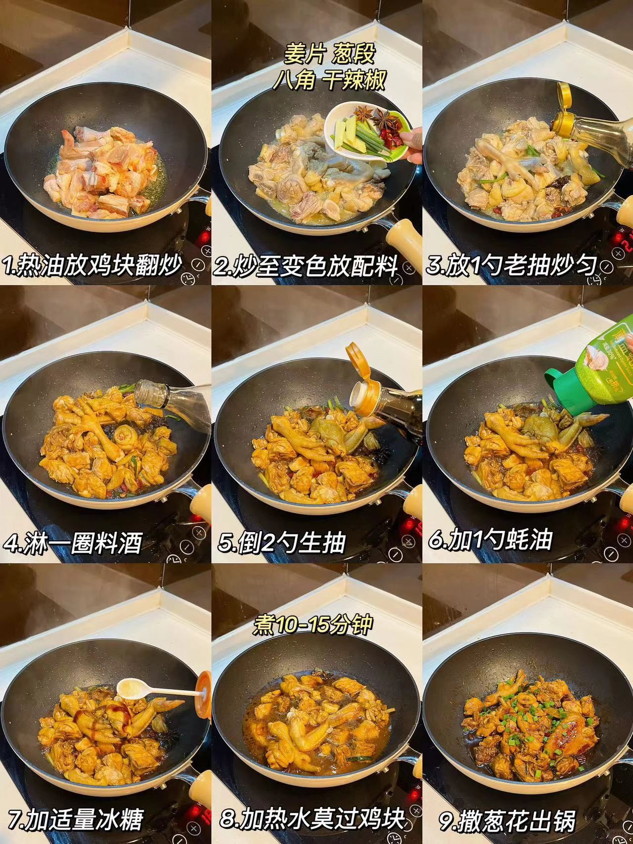 红烧鸡块算是一道家常菜中的常客,鲜香下饭,简单易学~ 🐓红烧鸡块 食材准备:鸡块 八角 干辣椒 姜片 葱 [一R]鸡块用冷水洗净血水沥干备用 [二R]起锅烧油,加入鸡块翻炒,鸡块炒至变色加入配料 [三R]等香料炒出香味后加入1勺老抽,锅边淋一圈料酒,2勺生抽,1勺蚝油,适量冰糖 [四R]加热水没过鸡块煮10-15分钟收汁撒上葱花即可 🥦蒜蓉西兰花 食材准备:西兰花 蒜 [一R]西兰花切块放在盐水中泡,洗净后焯水备用。热油爆香蒜末,加入西兰花翻炒 [二R]加入一勺生抽,一勺蚝油,翻炒均匀出锅