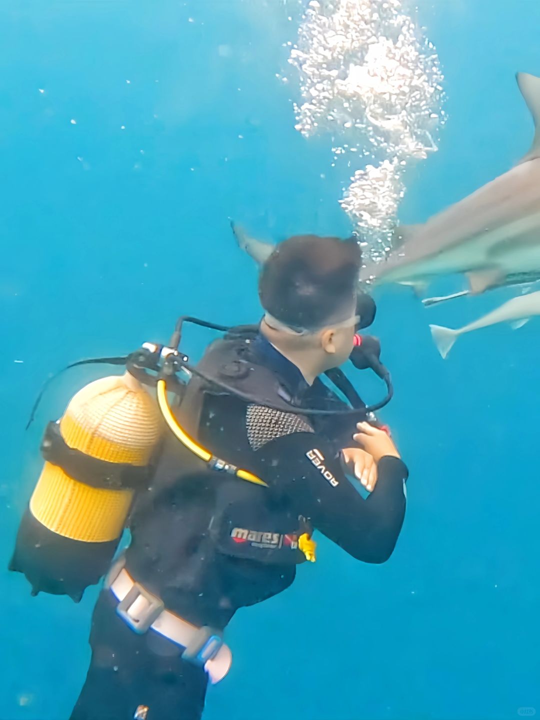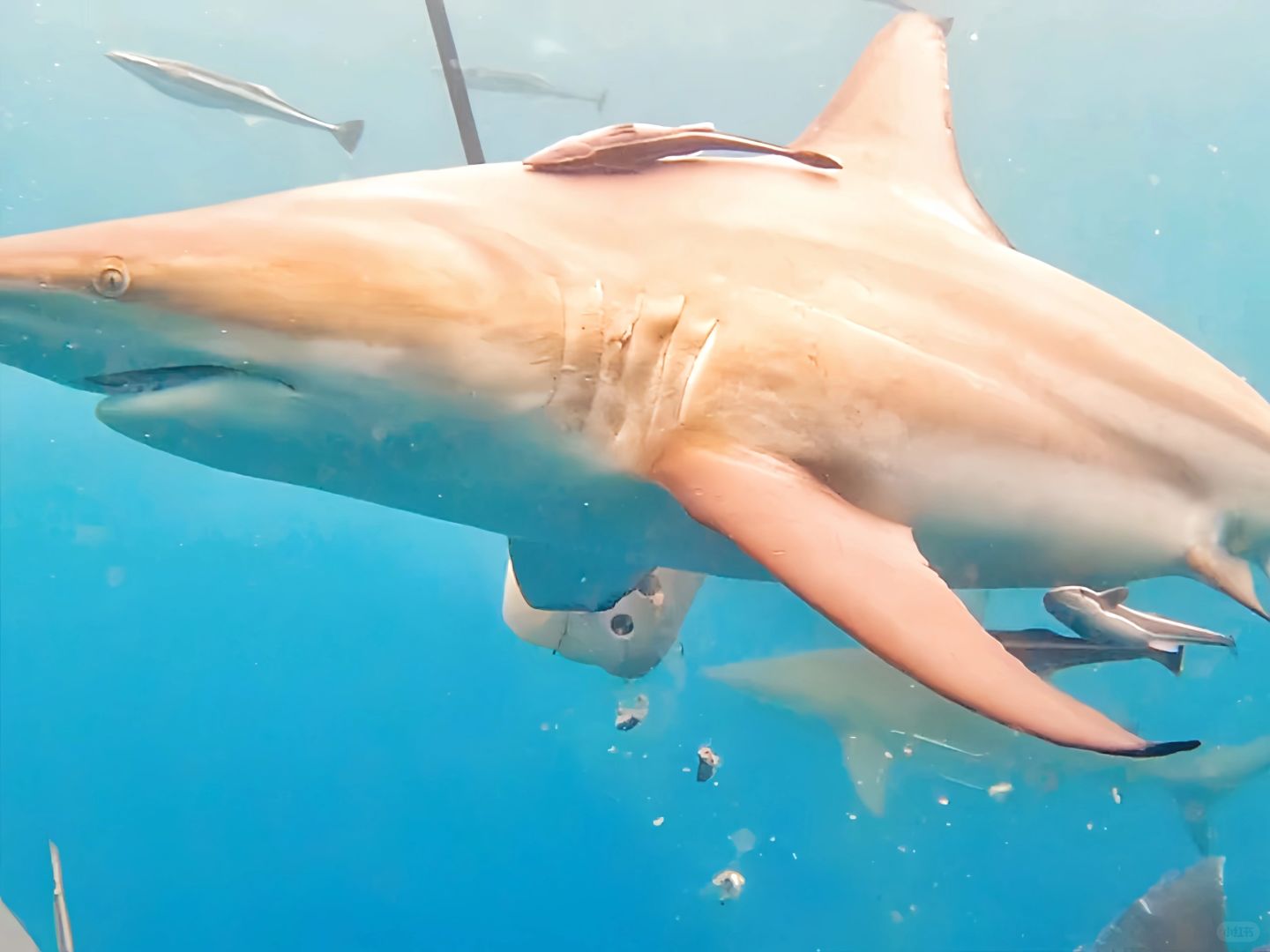 德班的主要目的就是来玩诱杀潜水。德班属于印度洋,这里除了有著名的沙丁鱼风暴,牛鲨,虎鲨这种大货常年盘踞在这。 我们是在德班ScubaXcursion Diving,水肺诱鲨潜水只要五百多一潜,普通潜水一潜更是只要一百多,对比国内简直是白菜价! 诱鲨潜水要求有较好的中性浮力,要可以在水下5m进行40分钟的悬停,aow以上。真的非常震撼,我们路上还看到了小鲸鱼和飞鱼!