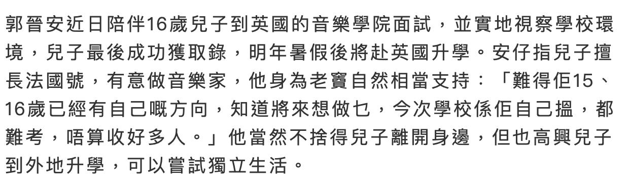 郭晋安陪儿子赴英面试,16岁儿子头发及肩长相沉稳,父子气质不同 香港艺人郭晋安在TVB的最后一部作品是2022年的《白色强人2》,之后他既无存货也没有再接拍戏剧,而是把更多的时间花在了打理家族生意上。郭晋安的儿子已经被英国音乐学院录取,将于2024年暑假后赴英国升学,郭晋安将陪伴儿子一起前往英国参加面试,并展开在当地的旅行。郭晋安表示,儿子的决定成为音乐家,自己非常自豪和骄傲,并且会尽父亲责任承担一切。虽然郭晋安身家丰厚,但他早已经表示不会将财产留给子女,而是会在有生之年用尽用光。