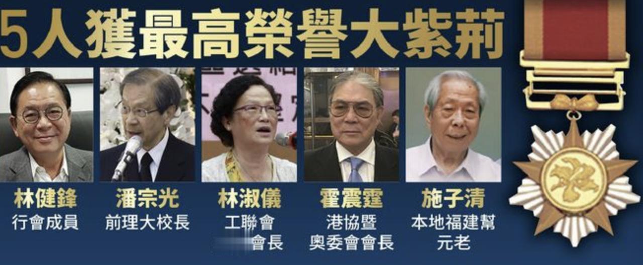77岁霍震霆出席授勋仪式,满头白发神采飞扬,仨子与儿媳到场见证 香港政府在2023年7月1日公布了年度授勋名单,霍英东的长子霍震霆获得了最高荣誉的大紫荆勋章。霍震霆的三个儿子以及儿媳到场见证了他获得勋章的时刻。霍震霆77岁,头发全白,状态很好,精神面貌硬朗,接受授勋时相当有范儿。霍震霆的父亲霍英东是第一位获得大紫荆勋章的人,霍震霆是霍英东的继承者,将父亲的遗志发扬光大。霍震霆获得勋章是对他做出贡献的认可,也是对他社会地位的认可。施子清是大紫荆星章获得者中最为年长的一位,他多年来致力于香港福建同乡会的发展,推动宗亲组织,促进香港与内地的文化交流。