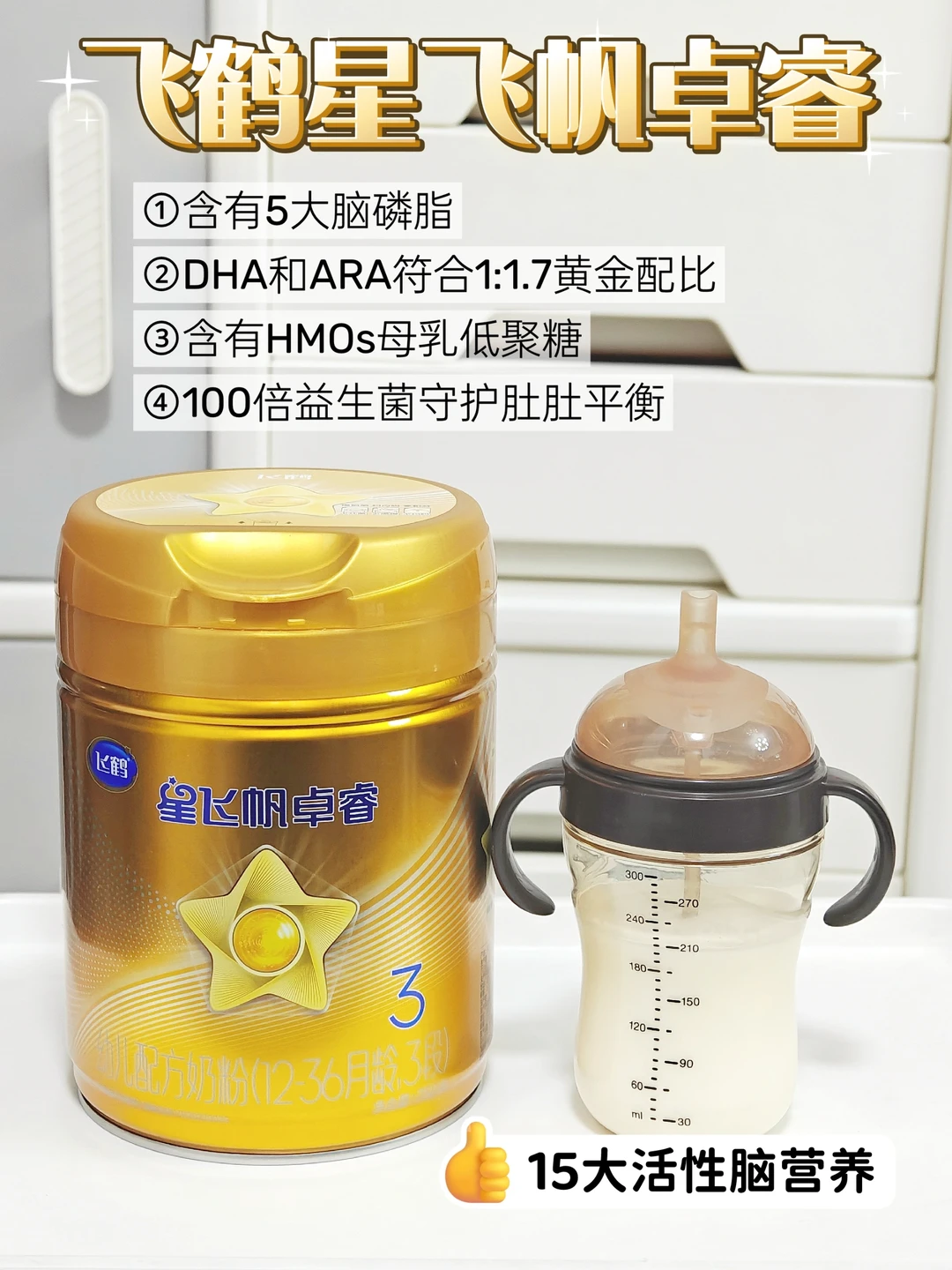 👉15大活性脑营养真的能打,不仅含有5大脑磷脂,DHA和ARA也设定为1:1.7黄金配比,营养更精准,还有HMOs母乳低聚糖的加特,宝宝营养稳了!