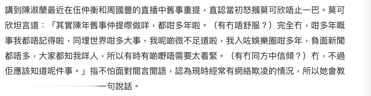 港姐莫可欣罕谈情敌陈淑兰,默认曾遭对方掌掴,称方中信不闻不问 方中信与陈淑兰和莫可欣的旧情被挖出来,陈淑兰承认掌掴过莫可欣。莫可欣也默认了这件事,她表示这已经是很多年前的事情,没有必要再提。三人早已放下,方中信与莫可欣结婚,陈淑兰至今单身。