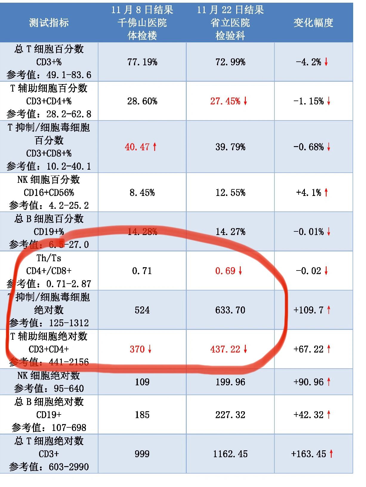 分享 [哭惹R]前后两次的抽血验血结果,已经让平时对身体自信的我,灰心丧气,毕竟数据不会说谎。CD4低于下限,CD8居高不下,CD4/CD8比值倒置,典型的免疫抑制状态,免疫力低下表现。回想自己经常性的口腔溃疡,即使长期使用多维也没有很大改观。[笑哭R] [皱眉R]我这样的状态不是一个消字号的鼻喷能解决的了,毕竟不是药物。经过一系列的问询和查找,免疫力调节药物是很多的,比如胸腺肽,胸腺法新,胸腺五肽,匹多莫德,还有人参,黄芪等。 [哭惹R]最终,我也走上了一条恢复免疫力的道路。