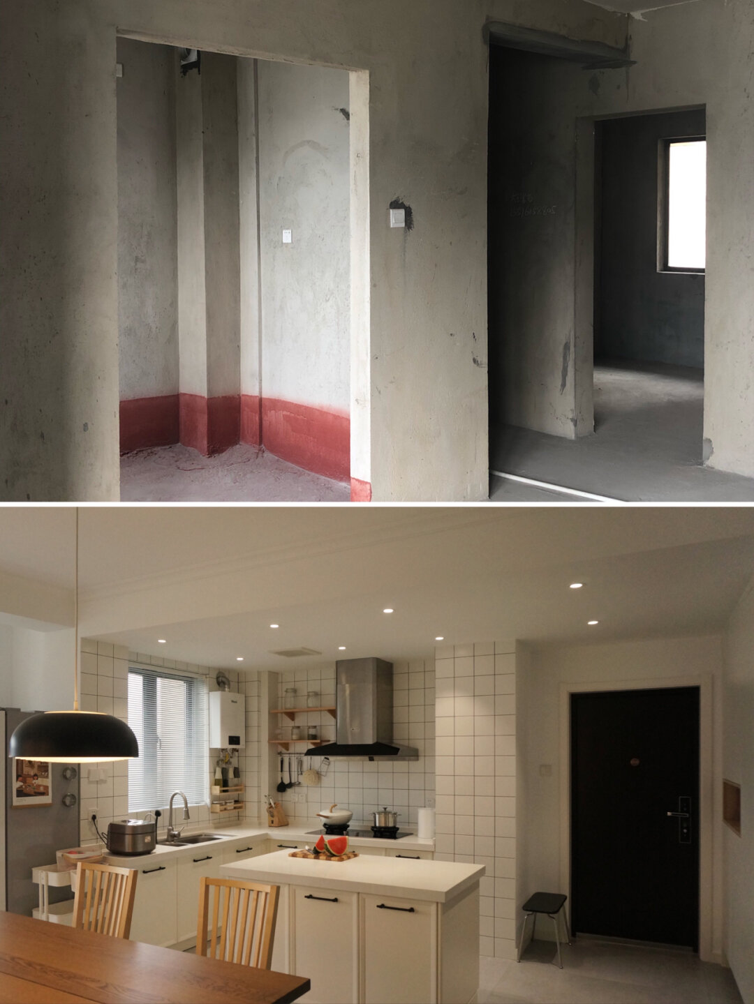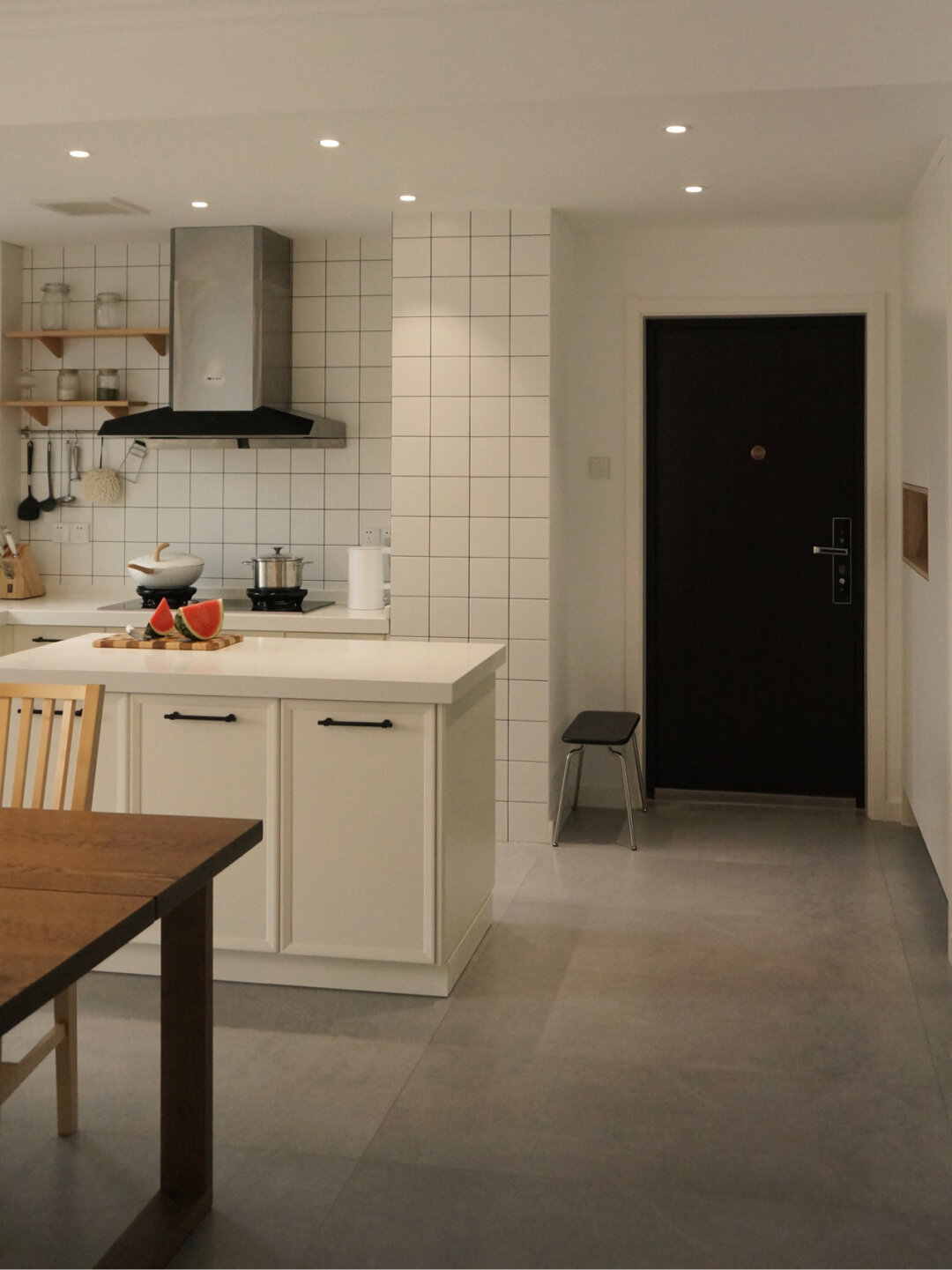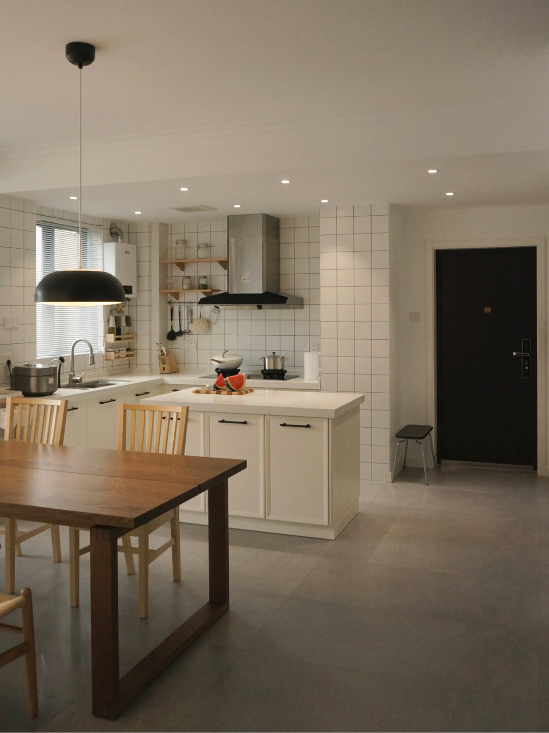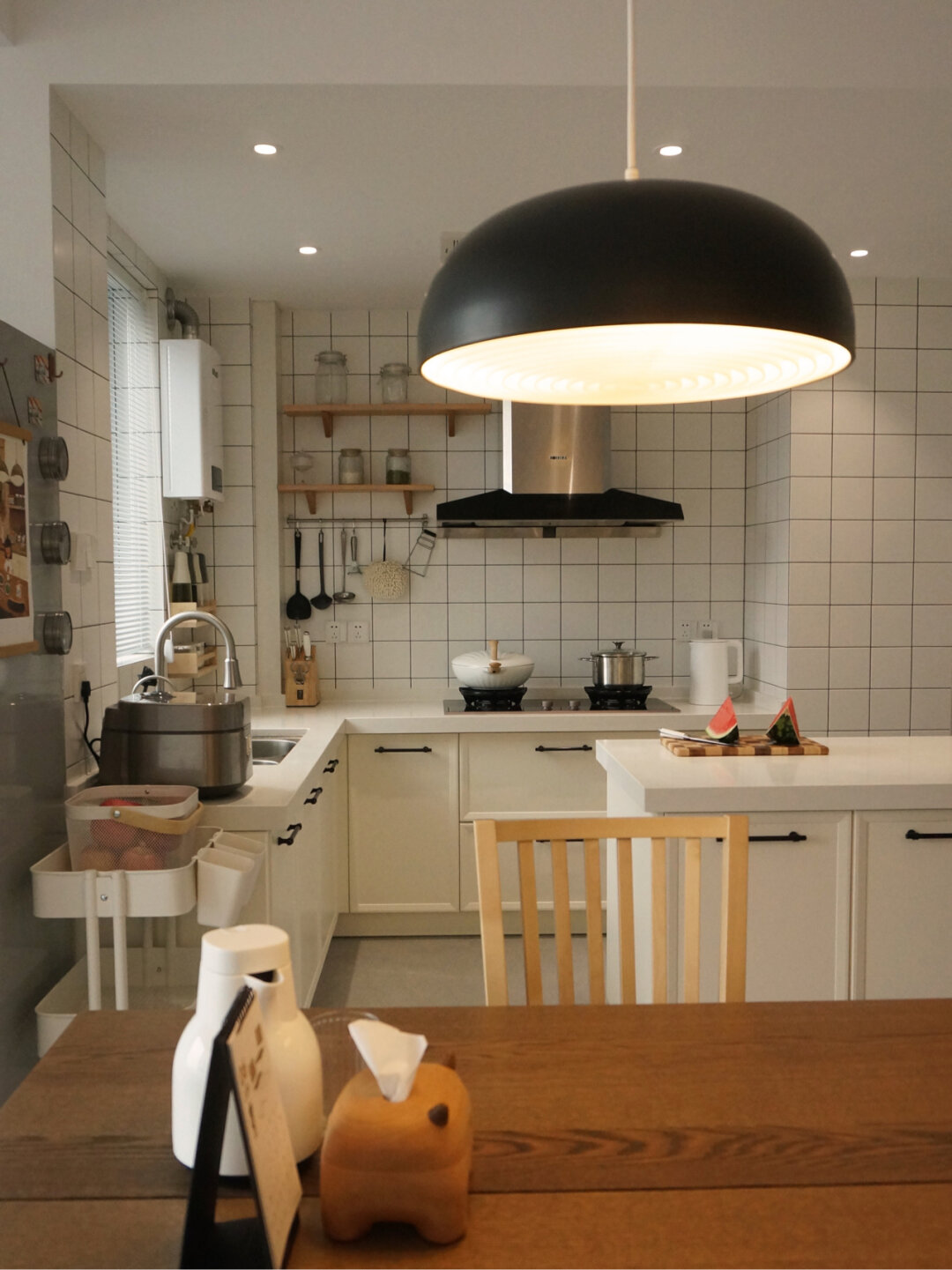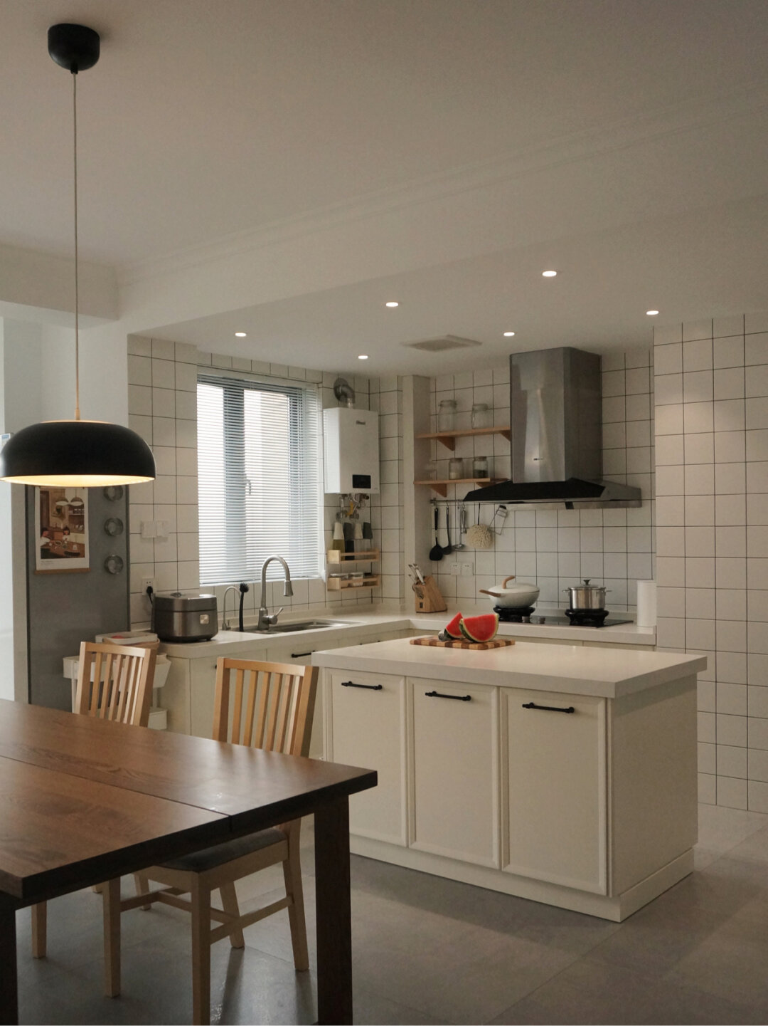 6㎡开放式厨房装修布局|改造前后对比&附尺寸 我家毛坯状态的厨房是封闭式的,只能做L型布局,为了使厨房台面空间更大,厨房更敞亮,打掉了入户位置这面墙,做成了开放式厨房,又加了一个岛台,厨房的收纳空间也增加了很多,整体效果出奇的满意。想做开放式厨房的 们,记得先把家里煤气开通问题处理好后再开始,以免装修后期出现麻烦。 · [微风] 具体厨房尺寸 厨房面积:长2.8米 宽2.2米 6平米左右 橱柜尺寸:地柜长3.9米 无吊柜 岛台长1.4米 宽0.8米 高0.85米 橱柜工艺:白色 膜压 墙砖:哑光小白砖 150*150mm · [微风] 能治愈我一天疲惫的开放式厨房 之前看过一本《德国式厨房规则》的书,里面有这么一句话:因为厨房是长时间停留的场所,所以想使之变得方便又舒适。我一直觉得下厨的时候能和家人一起交流是一件很幸福的事情,女儿也可以随时看到我们在做什么,父母那一辈下厨总是一个人在厨房忙忙碌碌,这也是我毅然决定选择开放式厨房的初衷。 · [微风] 定制的橱柜 厨房动线布局:冰箱取食材、水池清洗菜、台面备菜、灶台烹饪食材、装盘。动线规划合理,橱柜总长3.9米,岛台与橱柜距离0.9米,20000包含3.9米橱柜和岛台,台下盆工艺、拉手、水槽、抽拉龙头、百隆的阻尼抽屉、碗篮、拉篮、包管、踢脚线、进口百隆铰链、进口海蒂诗托底轨都包含在内。 们在定橱柜的时候一定要记得把想要的东西都提前谈好,然后所有谈的东西写在合同上面再交钱。 · [微风] 岛台的尺寸 岛台长1.4米 宽0.8米 高0.85米,橱柜和岛台台面是纯白石英石,岛台做了3个抽屉,高度不同,能收纳不同大小的物品,然后留有大空间收纳,平时用完的烤箱等一些小家电就会放这里。 · [微风] 做饭让我快乐 小厨房做成开放式,让我拥有了大厨房的体验感。干净清爽的厨房让我做饭也快乐,新家煮饭用的这个电饭煲,它不仅可以底部加热,上盖也可以远红外加热,煮出来的米饭每一粒都是很饱满的那种,软糯Q弹,每次煮饭坐在客餐厅都能闻到米饭的香味。颜值也很高,和厨房风格很搭。 · [微风] 开放式厨房油烟问题 谁说开放式厨房不能做中餐,因为家里有娃,所以基本每天都开火做饭,但并没有被油烟问题所困扰,选购油烟机的时候一定要选择吸力大的,保持干净勤快也是少不了的,做完饭及时清理整洁,要不然,时间久了会影响油烟机的使用,使油烟不易排除。 · 希望今天的分享,可以给正在装修或准备装修的 们一些帮助~