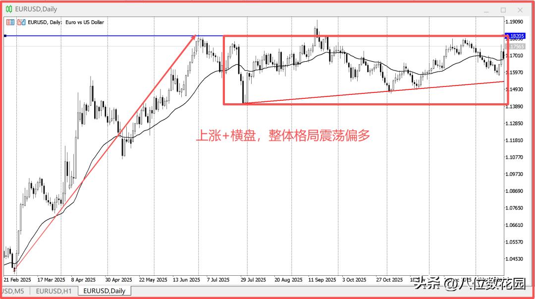 这张图中,行情从1.04530上涨,一路到了1.18205,然后展开了连续半年的高位震荡,整体的格局就是上涨或震荡偏多。