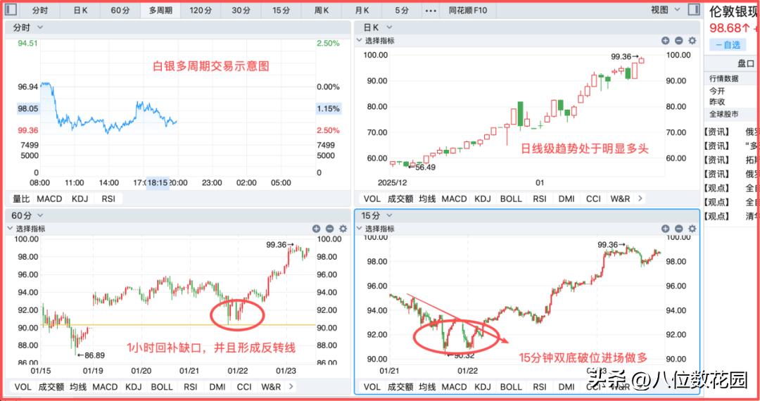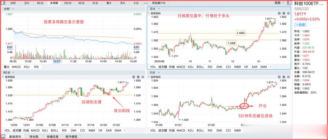 2、分享两个多周期交易的案例。先讲股票的例子,大家看下方的图表。