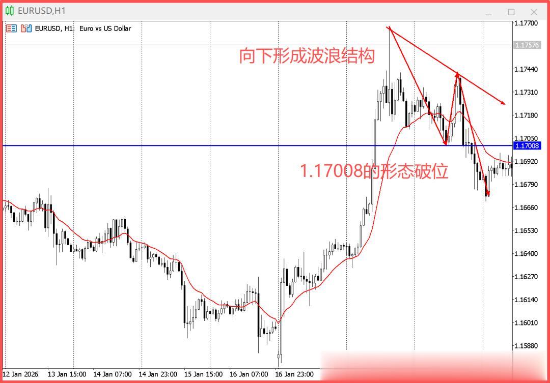 图中从1.17700一直下跌到1.16660附近,是一个完整的下跌浪的结构,1.17008的拐点也被下破,均线拐头向下。欧元兑美元1小时级别,毫无疑问整体是空头。