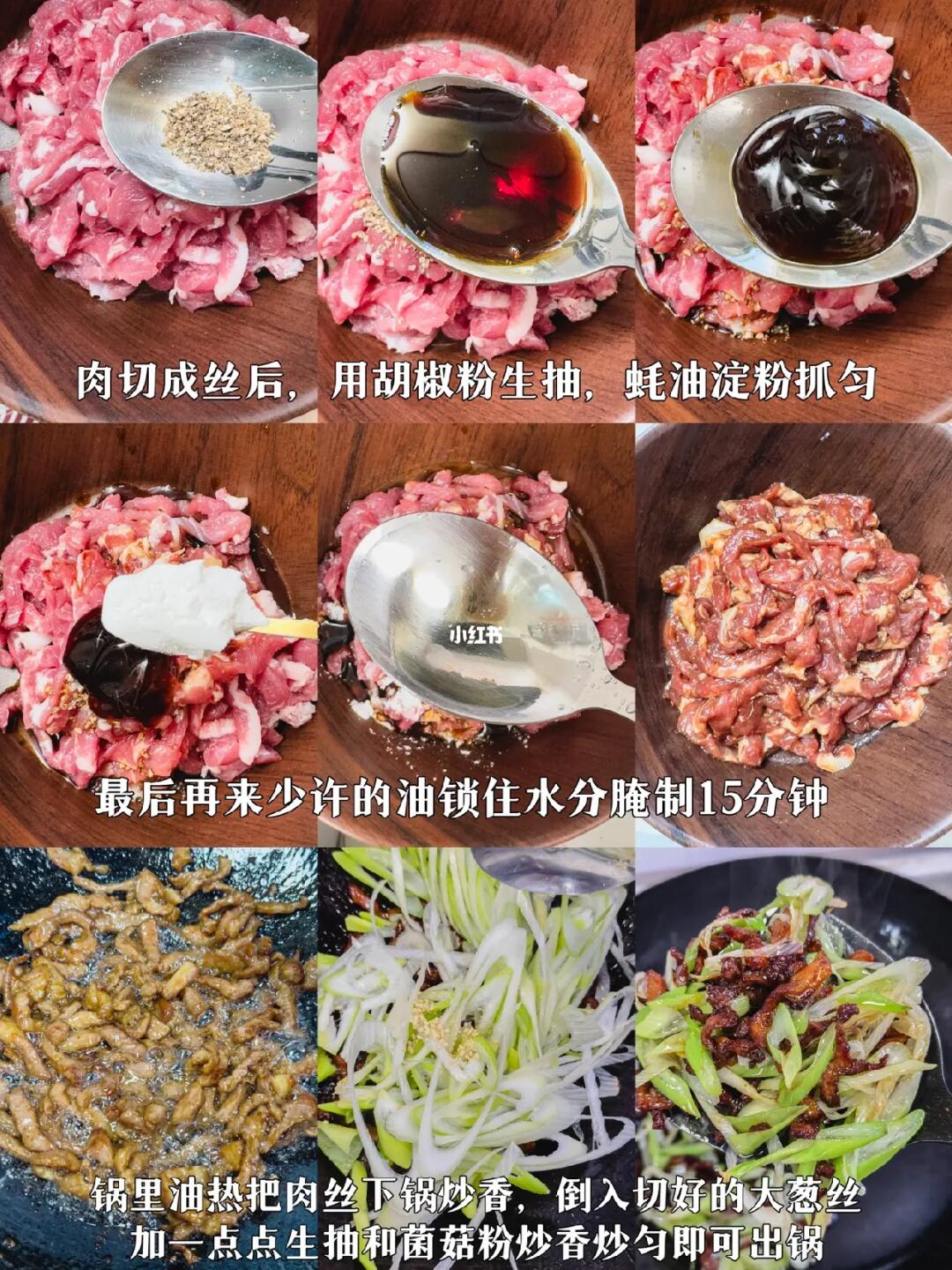 这几天的像是完全猜透了我的心思,不是给我推荐哈尔滨旅行攻略,就是中央大街的美景和各种仙女打卡的雪地美照,我现在真的就想马上飞去啊!!! 一下班就飞奔回家做起规划,等过年放假就能可以去了,今天就先吃个葱爆肉丝安慰一下我的心灵吧!! 🌈🌈🌈食材: 大葱、猪肉 🥘🥘🥘做法: 1、大葱和猪肉都切成丝,先把切成丝的猪肉用胡椒粉、生抽、蚝油和淀粉抓匀,来一点点油锁住水分腌15分钟 2、锅里油热把肉丝下锅炒香,倒入大葱翻炒均匀,最后加点生抽和菌菇粉即可出锅
