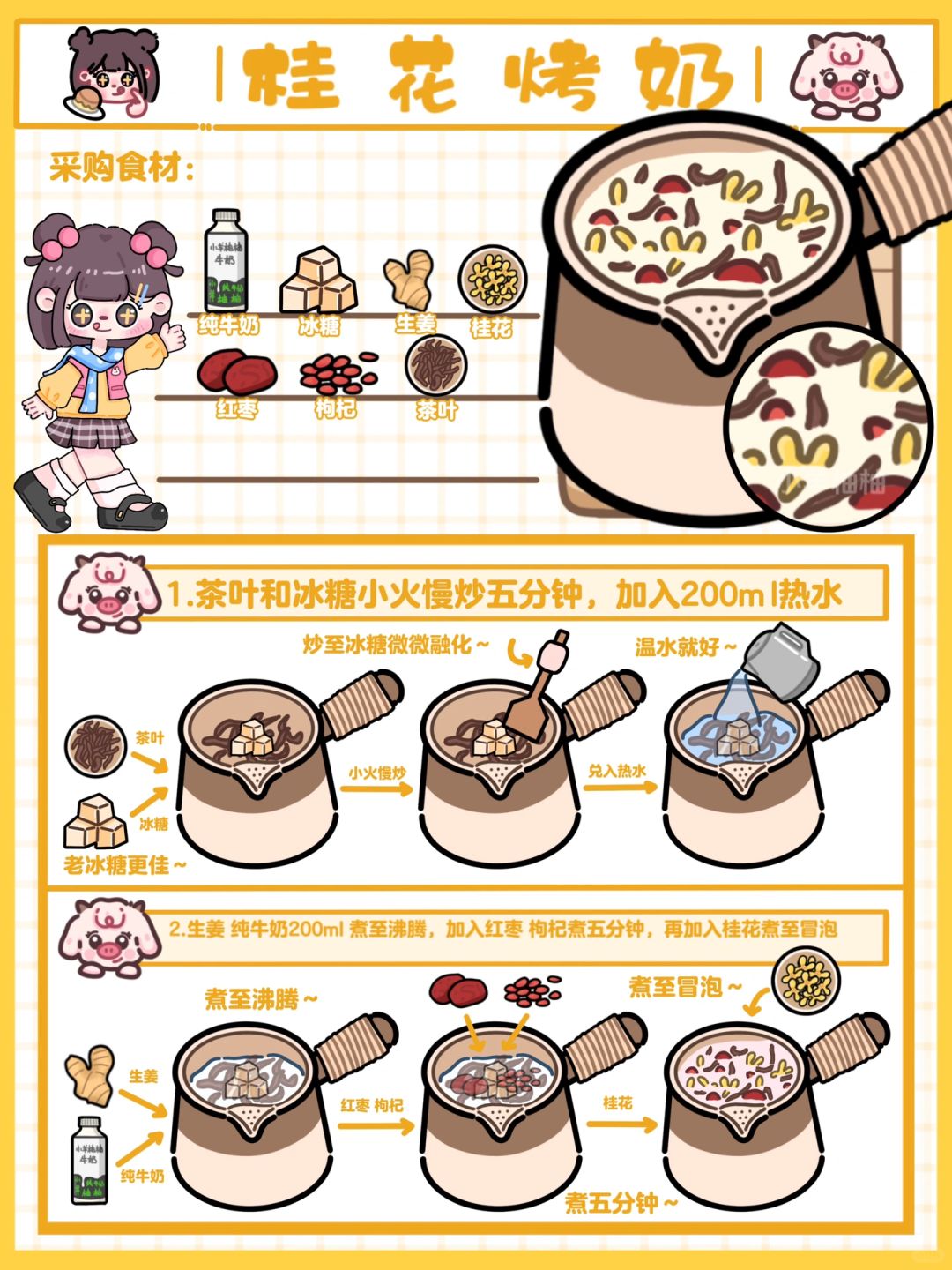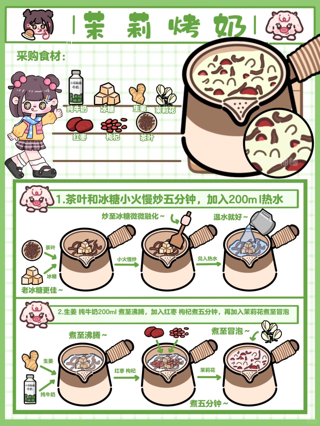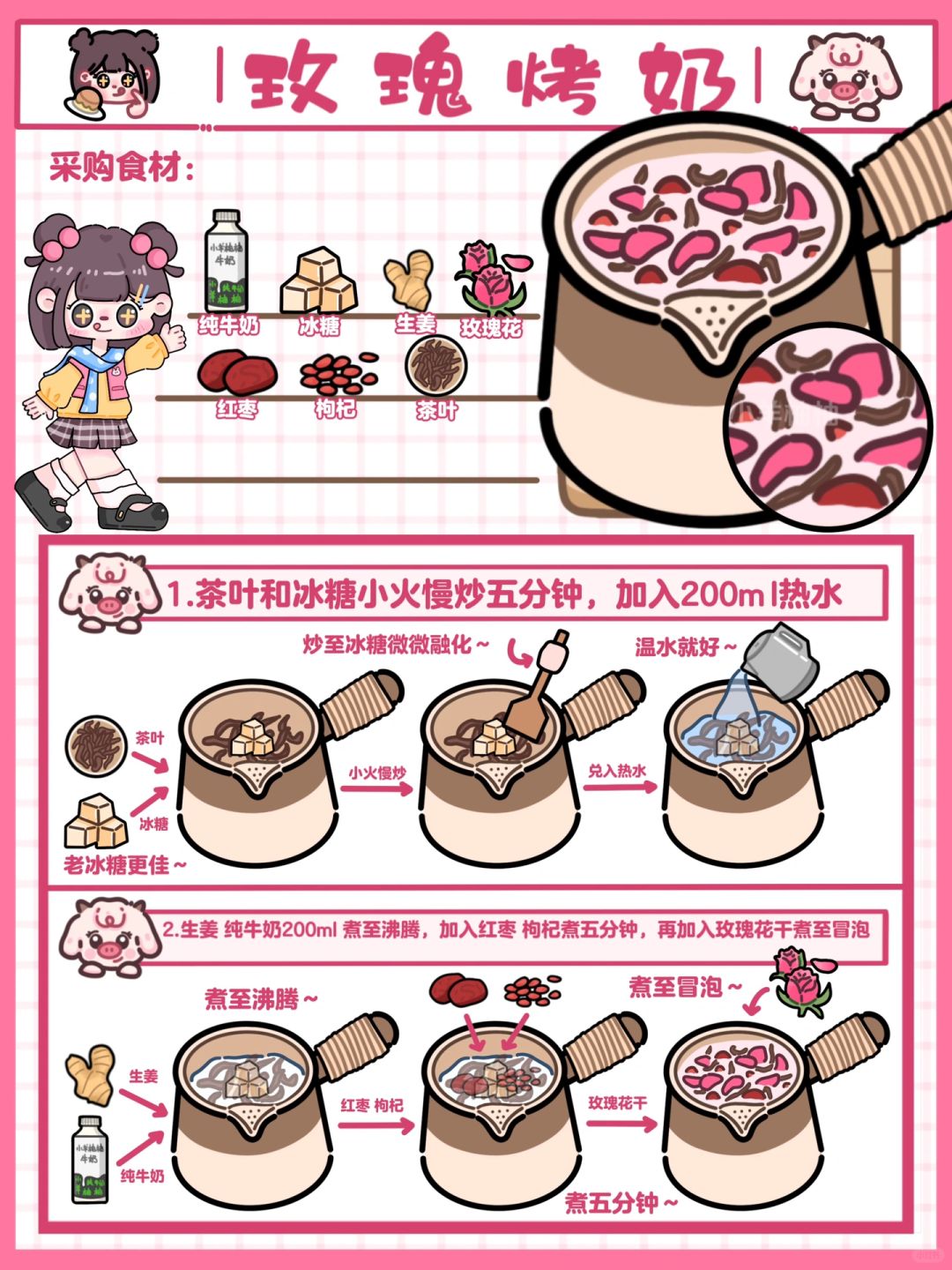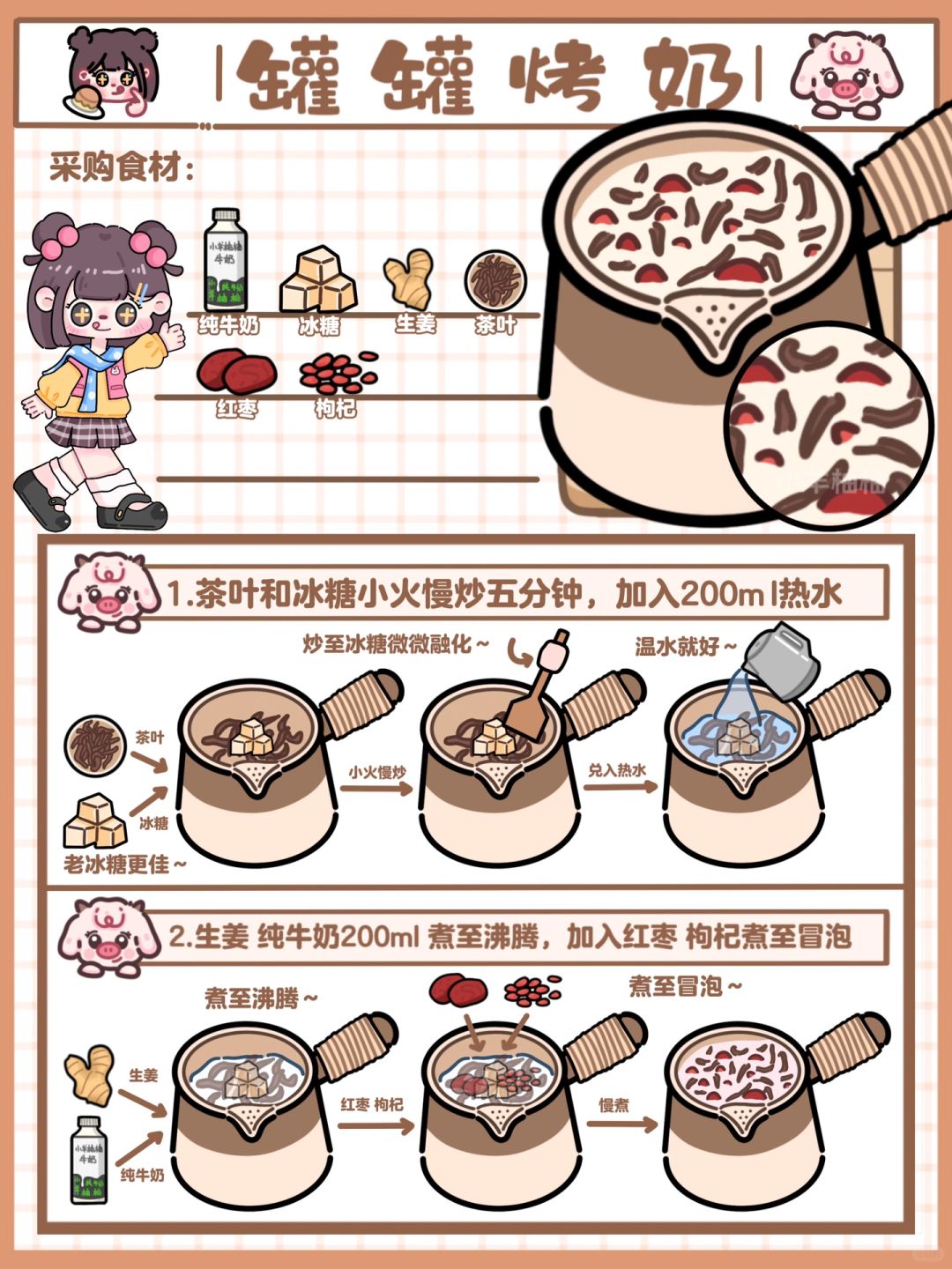 Hi!这里是小羊柚柚~ 今日份温暖人心动💓罐罐烤奶来喽!轻松掌握四种暖暖的冬日饮品🧃爱她/他就快点轻松两步给她做一罐吧🫙醇香浓郁 还飘着淡淡的花香,红枣 枸杞对她的身体也不断滋补,既可以暖她的胃 又能够养她的肌肤 还能换来一颗更爱你的❤️,而这一切只需要轻松两步‼️性价比up!up!四种口味一周给她换着做,每天早晚来一罐 营养健康轻松得😋 - 🥣食材准备 纯牛奶🥛|冰糖🍬|生姜🫚|玫瑰花🌹/桂花/茉莉花|红枣|枸杞|茶叶🍂 - 👉制作步骤 1️⃣茶叶和冰糖放在锅中炒至焦糖色(即冰糖微微融化🫠),加入热水♨️200ml 2️⃣生姜🫚和纯牛奶🥛200ml下入锅中煮至冒泡(小火慢慢炖 大概5分钟左右),加入玫瑰花🌹/桂花/茉莉花煮至冒泡🫧(也可以不放就直接开喝) - 🌟小tips 寒冷的冬日❄️真的很需要一杯温暖人心的饮品🧃又营养又美味🤤加入不同的花瓣就是不同的口味,怎么喝都不会腻~不喜欢吃太甜的可以少放一点冰糖(老冰糖更健康哦~)生姜🫚起到了驱寒暖胃的作用,不喜欢的也可以不放,红枣和枸杞都是对身体很好的食物,冬天在被窝里有人递上一杯🥃暖暖的烤奶,不敢想她会有多幸福🥰 - 感谢喜欢💕我们下期见喽~ 欢迎👏点菜