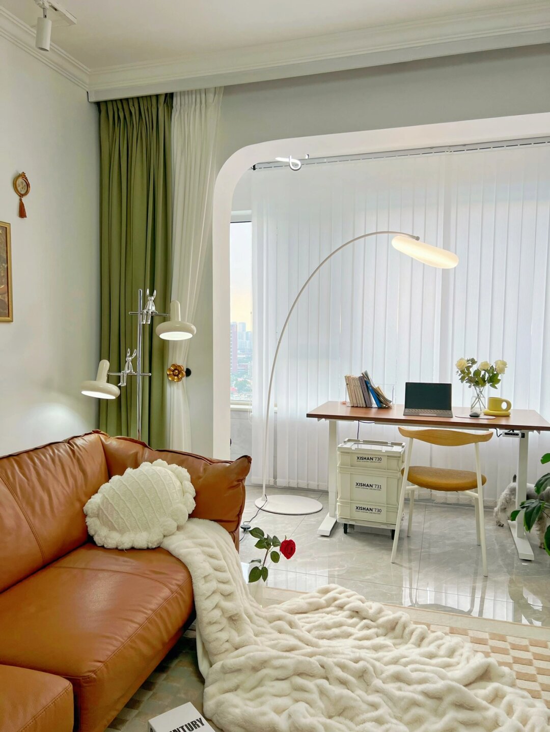 在阳台布置了办公区,放了新书桌 拉开百叶就能看到窗外灯火通明的夜景 坐累了就调解到站立的高度,缓解一会