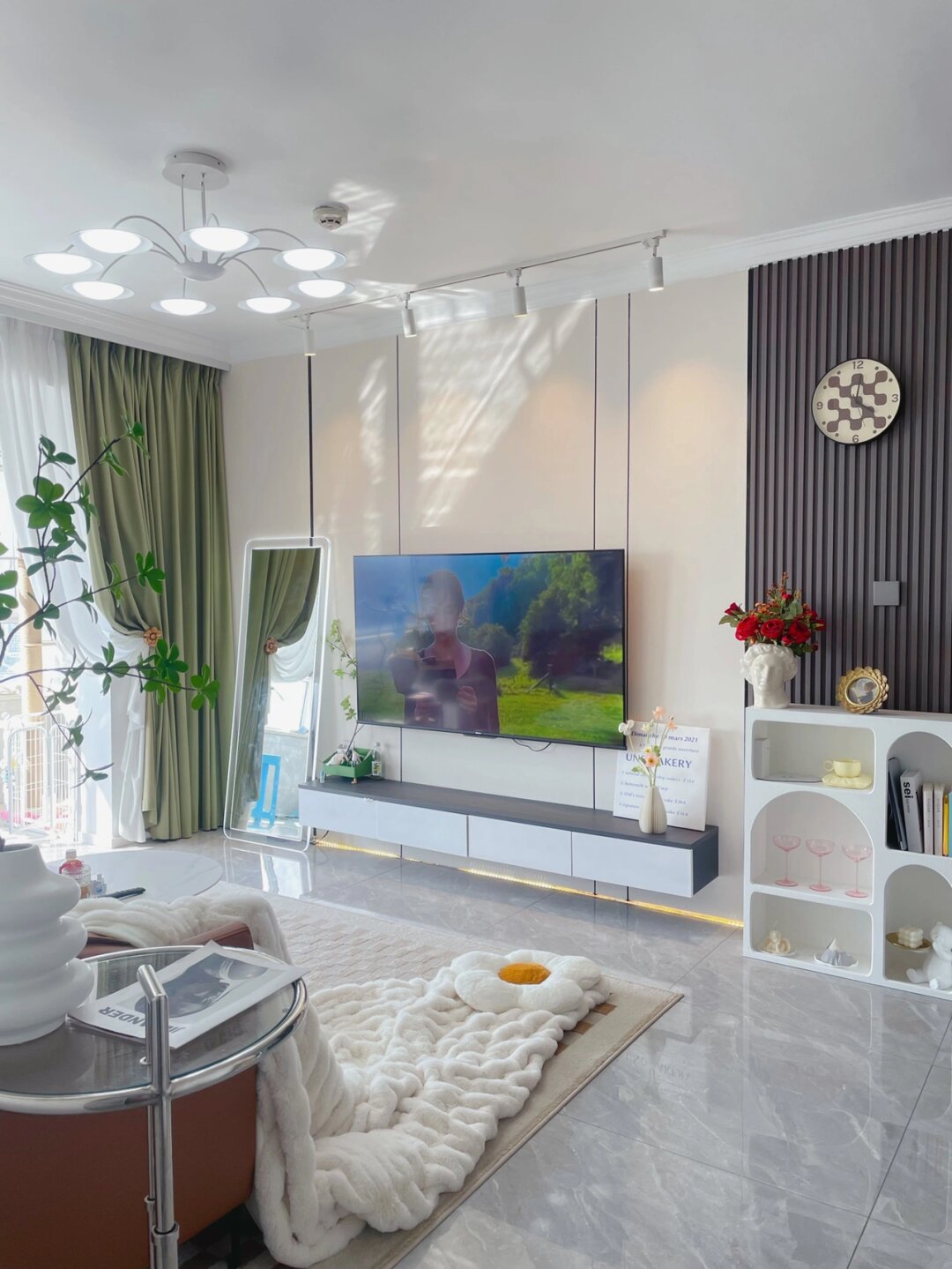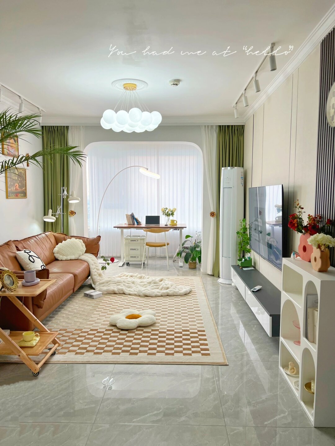 没做复杂吊顶,星球灯吊灯增添几分装饰感 沙发背景墙放了装饰画和棕榈树相对应 - 10w 内装出这个效果真的觉着很棒了,所有的心血没都没白费,住在自己设计的家幸福感满满