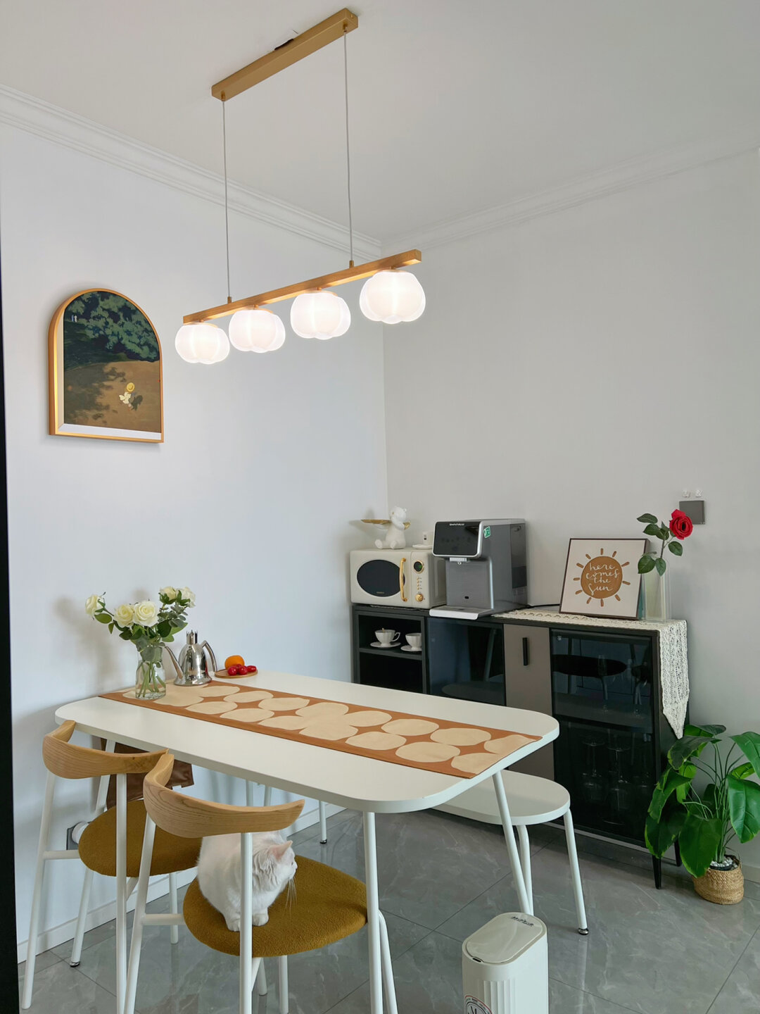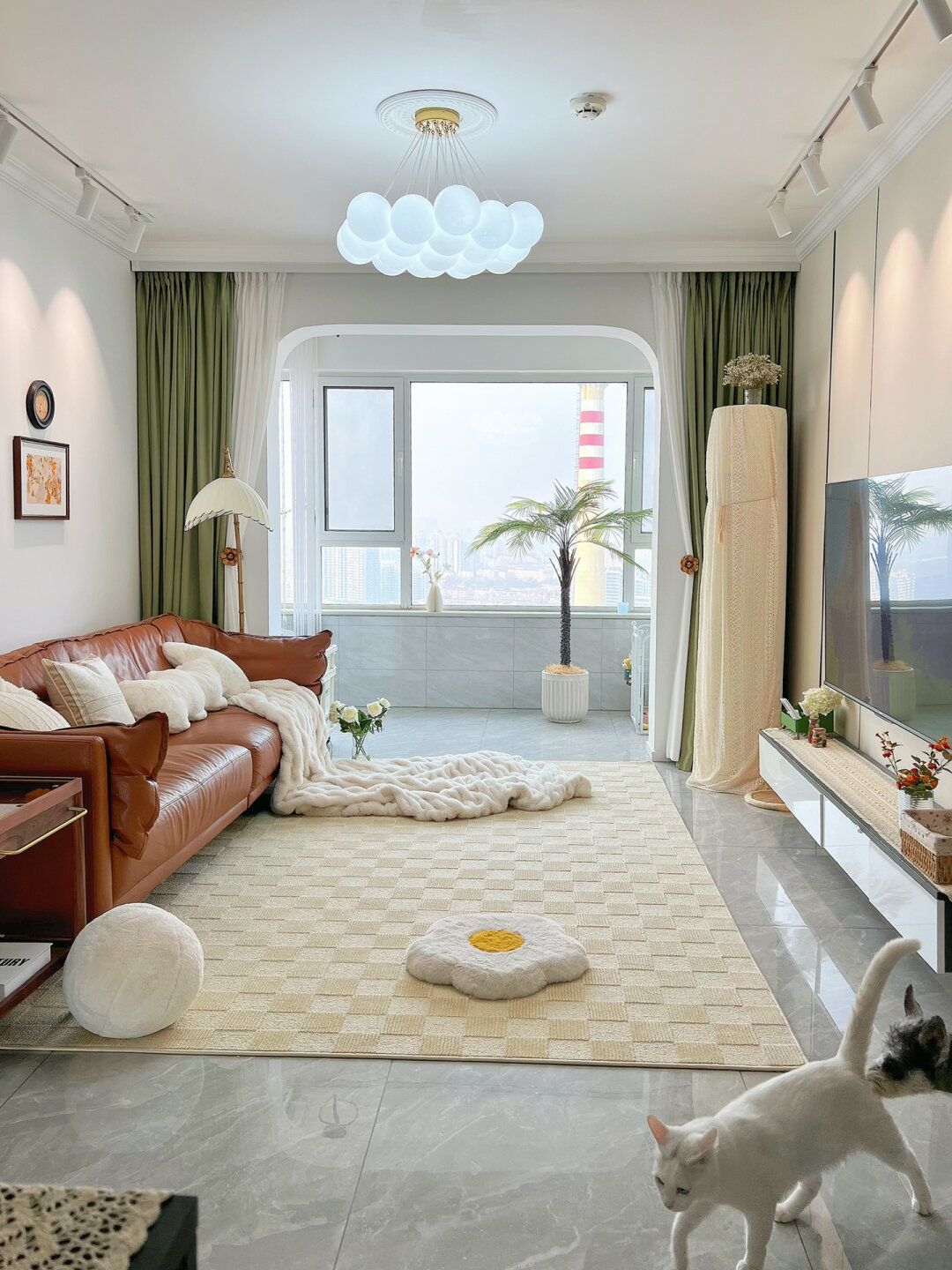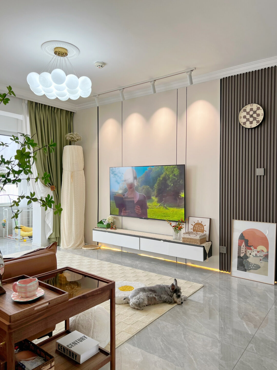 6w自装的家,朋友都说得30w吧[微风] 建筑面积109平,套内85平,公摊24平 三室两厅一卫一厨 硬装6W,软装3W 虽然不豪华,但朋友来了之后都说得花不少吧~ 我来跟大家免费分享一下小户型装修经验 - 确定风格[微风] 简单硬装 普通人的家还是要清清爽爽一点,就一切从简了,没做吊顶,显层高,两侧安装了明装轨道灯,给房顶增加装饰感. - 轻装修 [微风] 重装饰 硬装真的越简单越好看,简简单单,看着就宽敞舒服,软装可以根据自己喜好随意搭配. - 小户型餐厅[微风] 超薄餐边柜 餐厅虽小,五脏俱全,餐边柜30cm足够日常用的,搭配原木色吊灯,柔和的色彩更温馨,棉花造型更有艺术感. - 全屋大白墙[微风] 纯白踢脚线 白墙让家白到放光,视觉上显大,时间久了也不会看腻,而且软装怎么搭配都不会出错,4cm实木踢脚线显得更加精致. - 客餐厅瓷砖通铺[微风] 中灰色瓷砖 真的适用于任何户型,视觉上增加延伸感,干净利落.