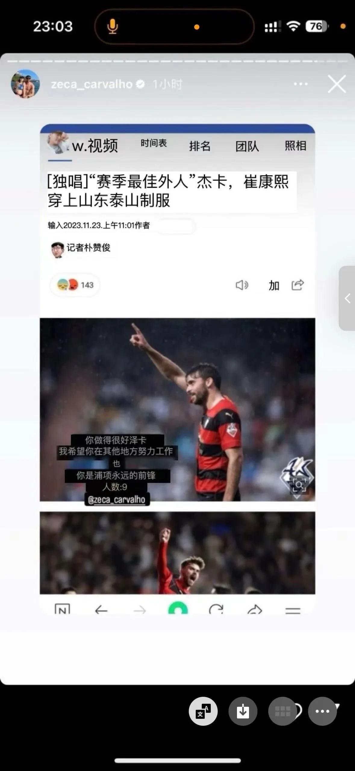 下树?山东泰山队绯闻外援泽卡转发了韩国媒体报道他加盟山东泰山队的新闻,目前泽卡已