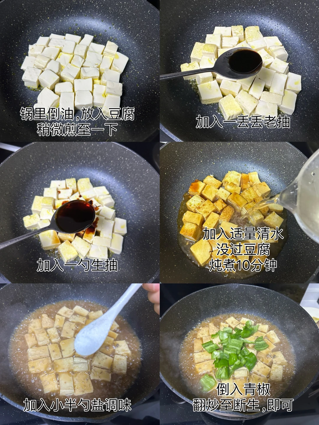 1️⃣锅里倒油,倒入豆腐,稍微煎至一下,加入一丢丢老抽,一勺生抽,加入适量清水,没过豆腐,炖煮10分钟