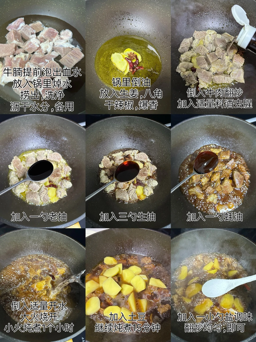 2️⃣锅里倒油,放入生姜,八角,干辣椒爆香,倒入牛腩翻炒,加入适量料酒去腥,加入一勺老抽,3勺生抽,一勺蚝油,翻炒均匀,加入适量开水,大火烧开,小火炖煮一个小时